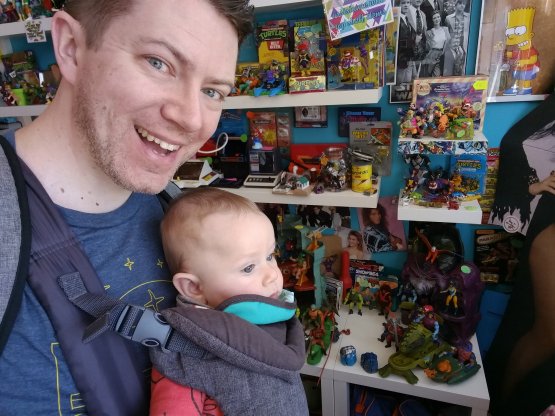I narrated our journey through the store, which basically amounted to me saying, “Look, Miles! It’s [’80s toy]! That’s what daddy played with when he was a kid!” while Miles blew raspberries. I can’t tell if he was excited or critiquing everything.