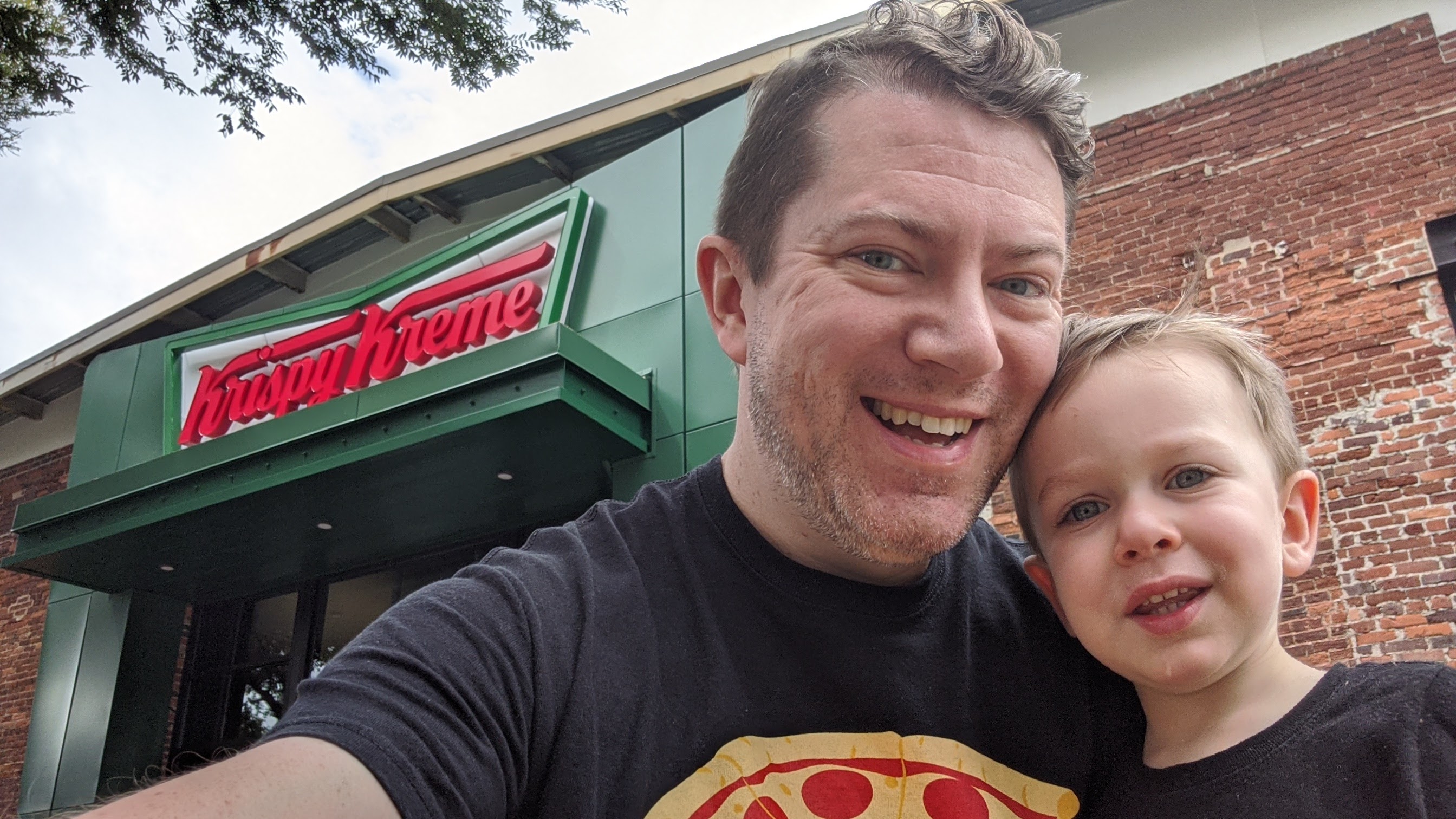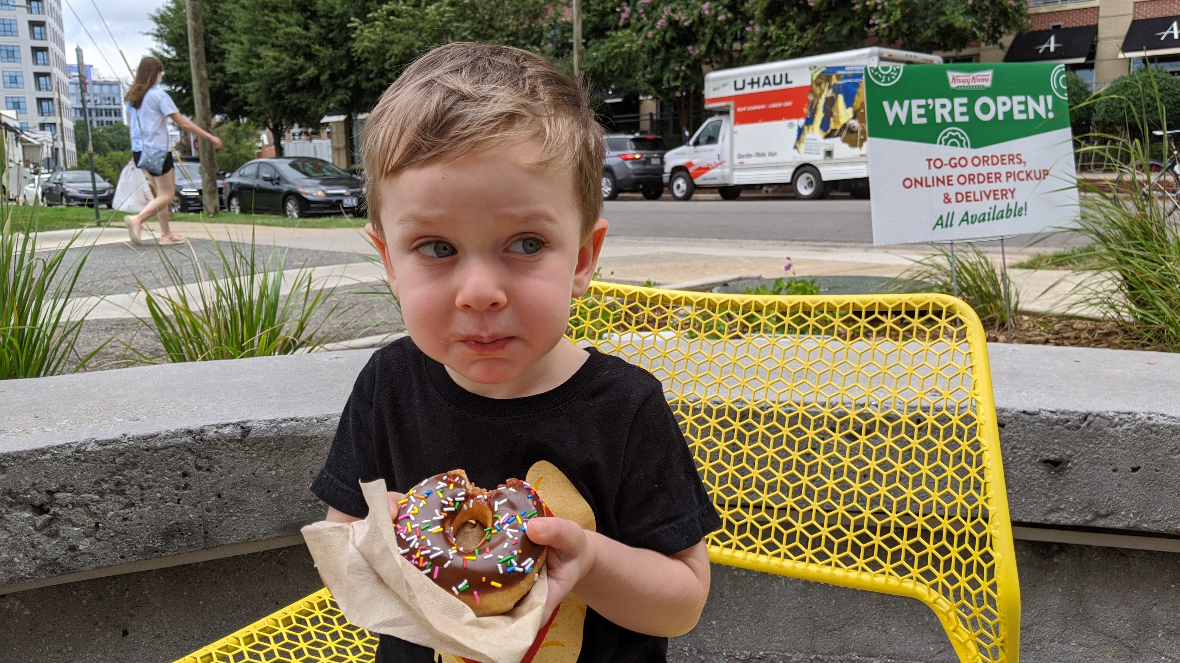 Miles was very particular about wanting a chocolate frosted donut (“…and with sprinkles!” he added as almost an afterthought). Krispy Kreme did not disappoint!
