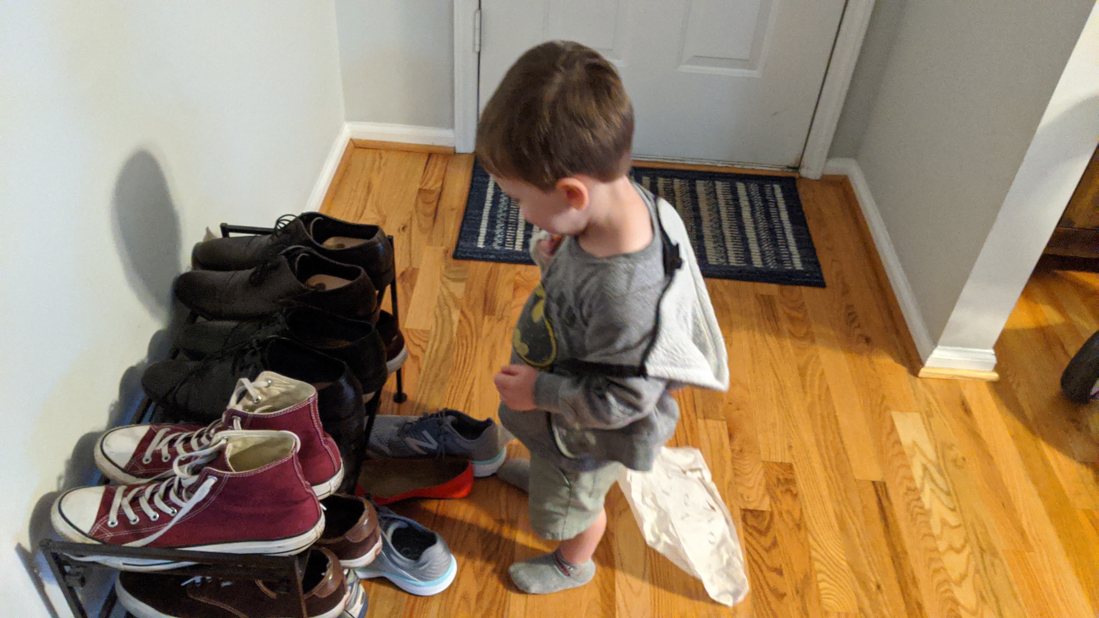Jaclyn picked up some new running shoes today, and Miles wasted no time removing them from their box and putting the shoes where they belong.