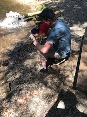 Miles enjoyed a breakfast overlooking the mountains, filling his belly before we all headed out to a trout farm to break in his new fishing rod. Having observed the activity countless times as I’ve played Animal Crossing this year, Miles was thrilled at the prospect of catching a fish (“Come my friends!” he said as he scooped up his Mickey, Donald, and Goofy dolls to bring with him). At least, he was excited until I actually had one hooked. That was when he quickly backed away.