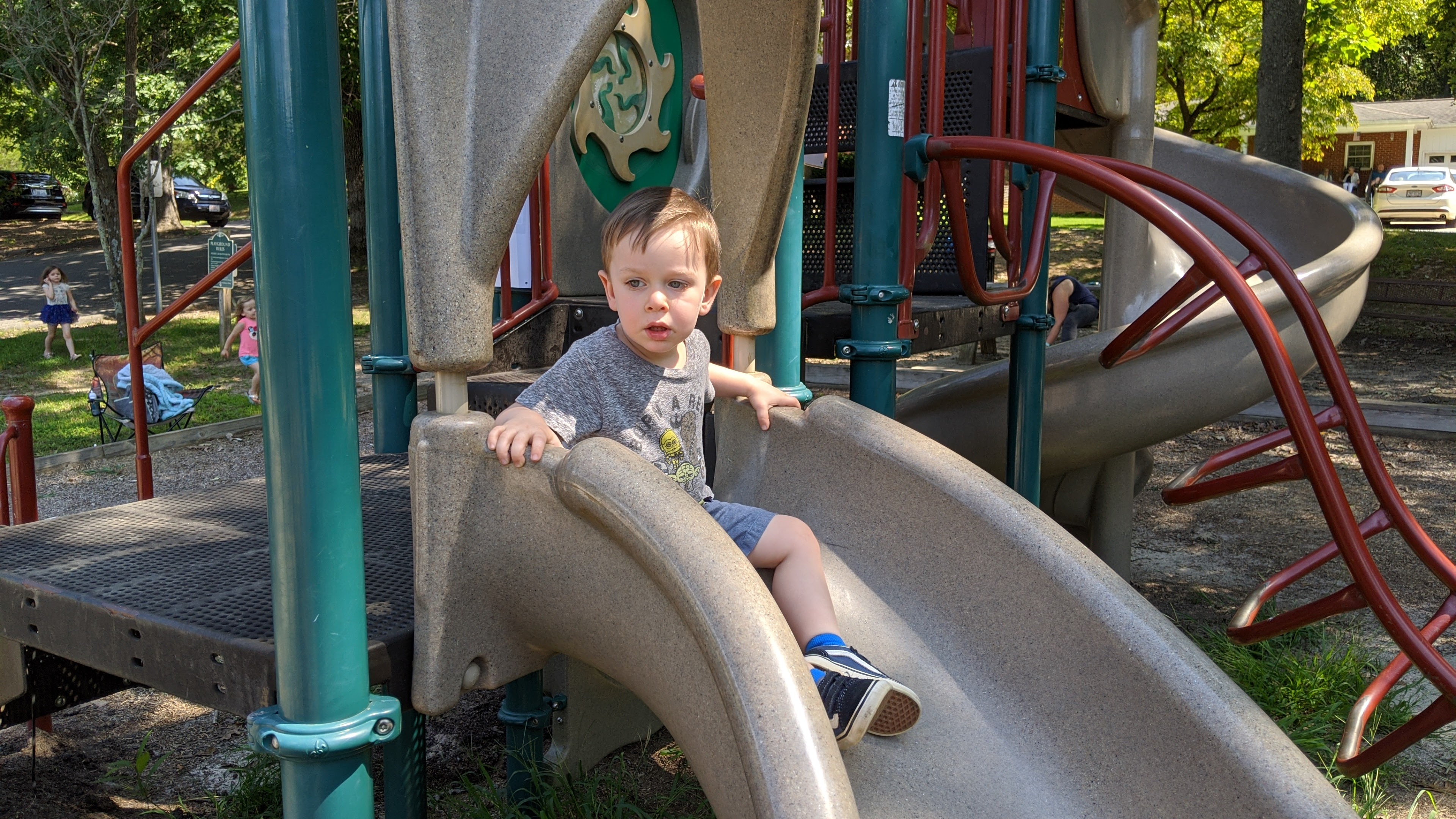 After a nice walk around the lake, Miles got to experience the joys (and initial trepidation) of slides big and small.
