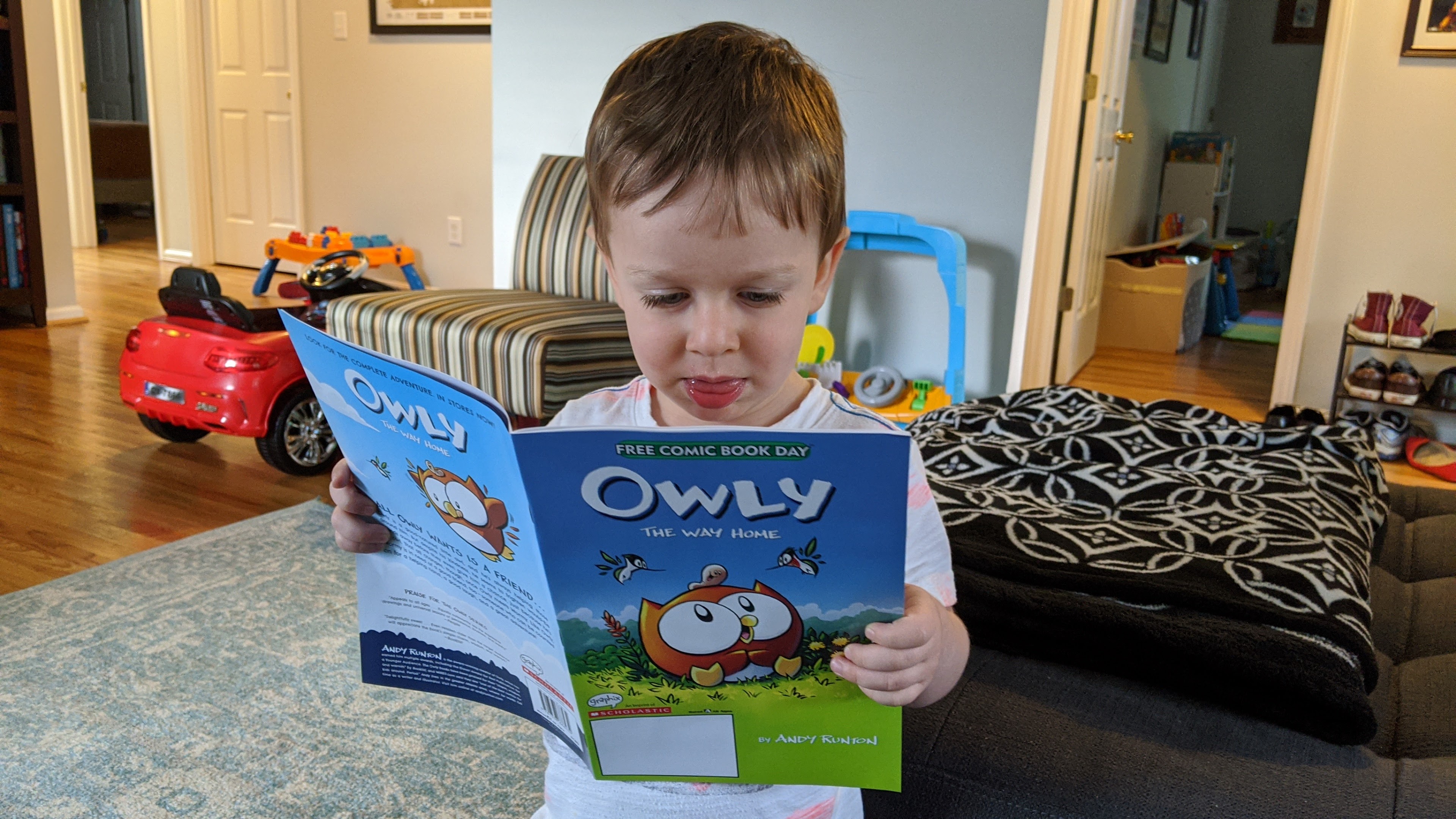 I brought home one of this year’s Free Comic Book Day offerings for Miles and his eyes absolutely lit up when I handed the book (Owly by Andy Runton) to him. “It’s my comic book!” he beamed.