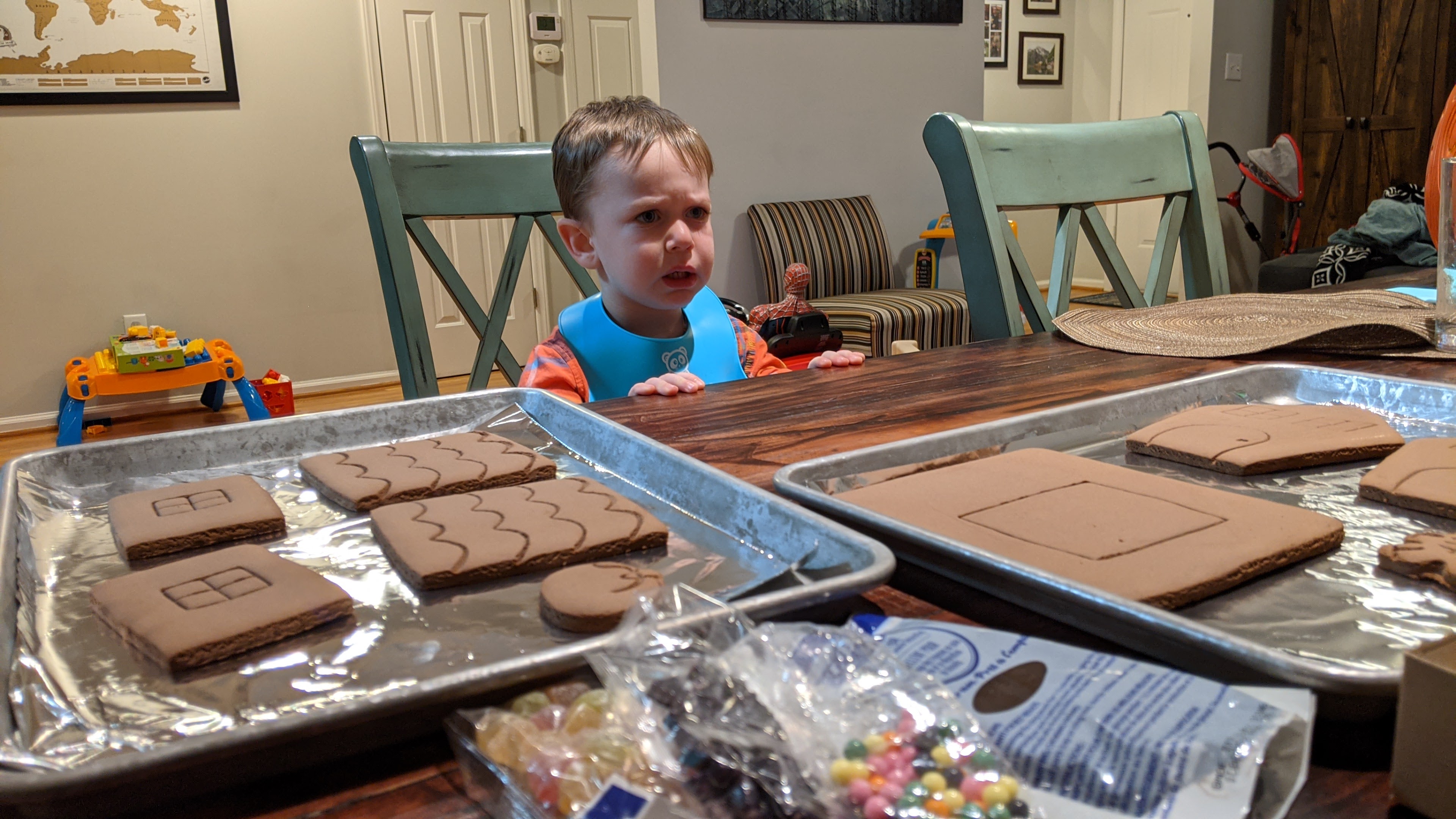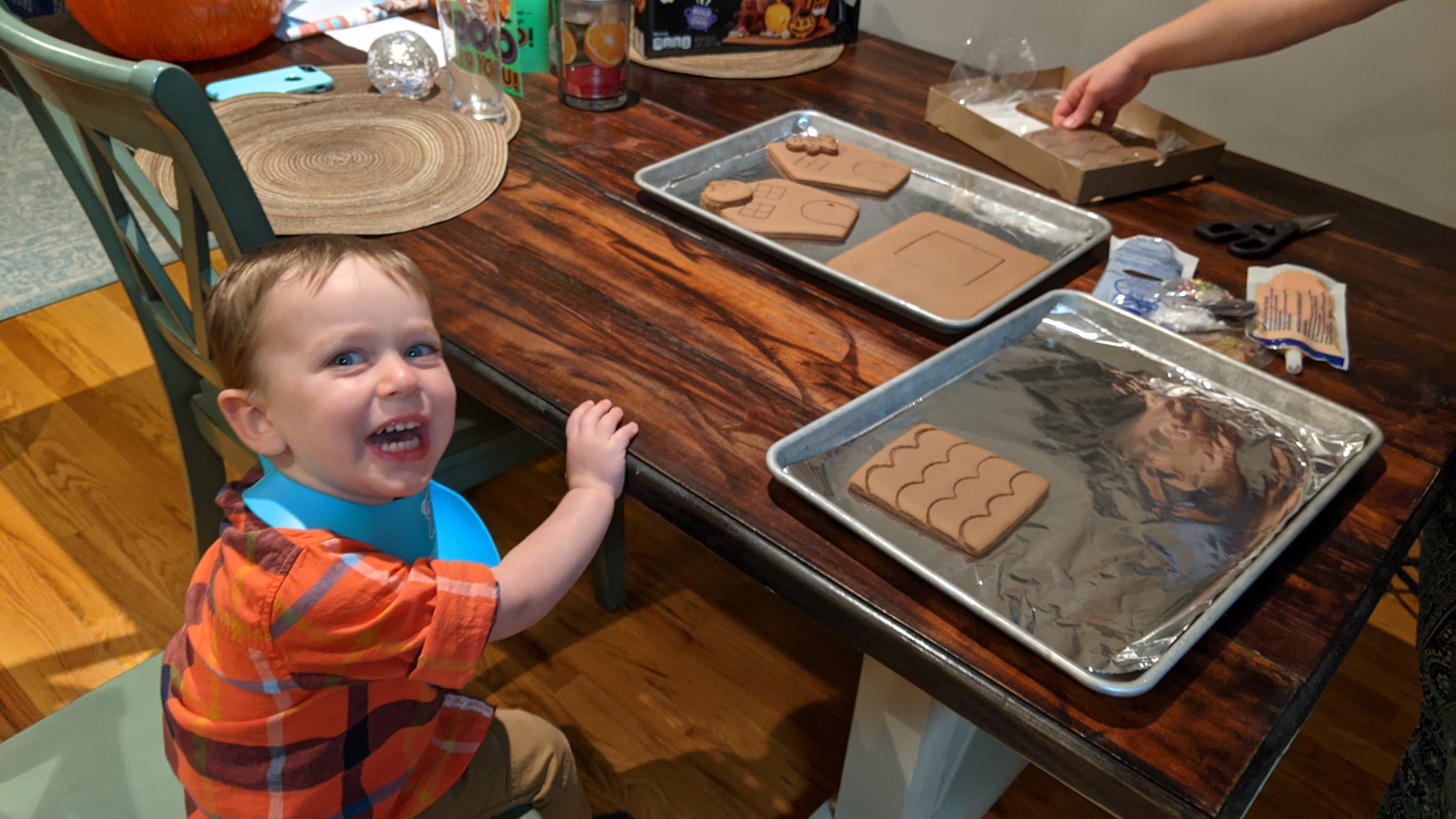 Miles is in full Halloween (and occasionally Easter) mode right now, and we continued to celebrate the season with a small family project this evening, building a haunted gingerbread house.