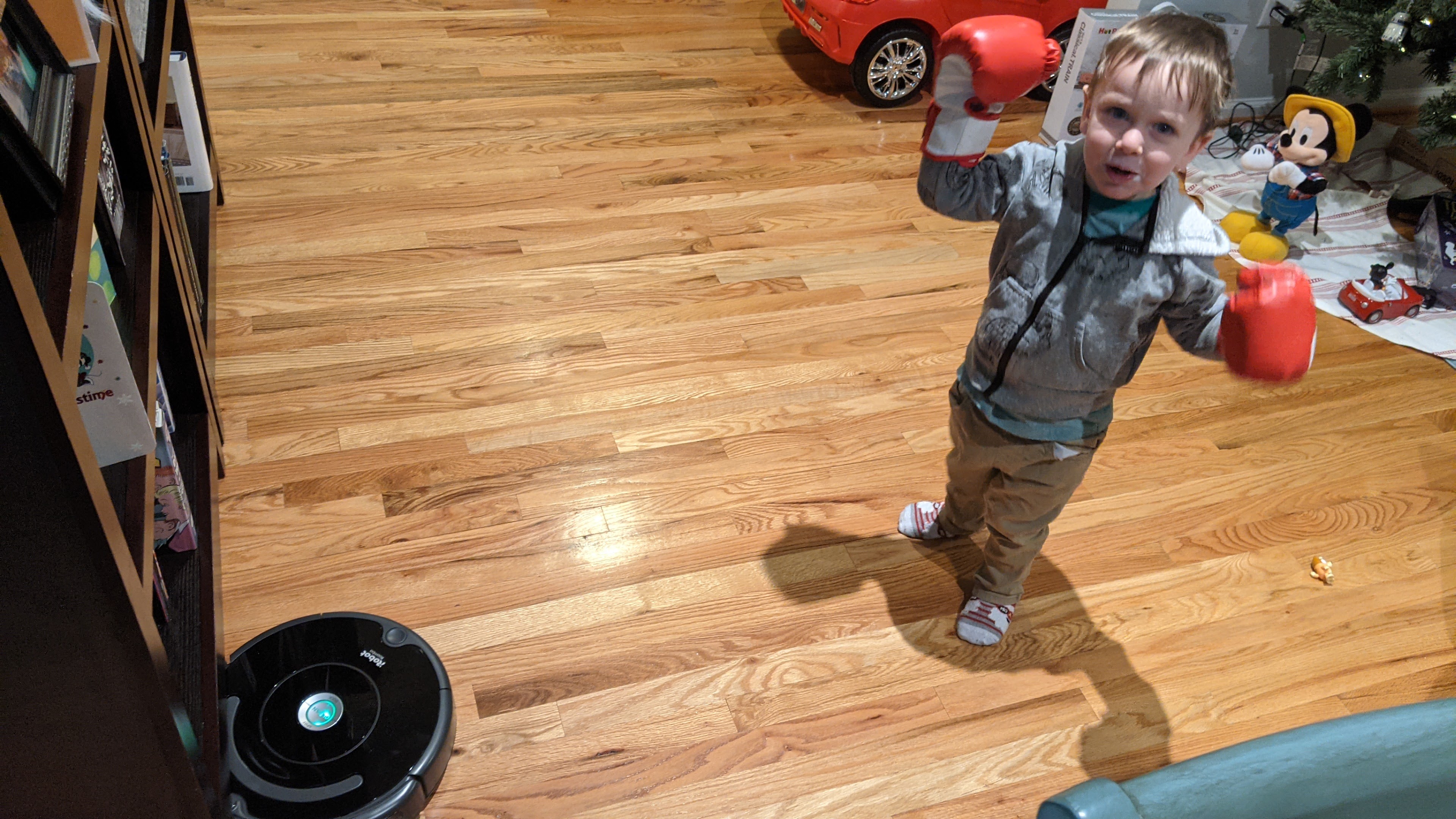 After the dust settled (WARNING: PUN INCOMING) and Miles was occupied with his new toys, I was finally able to open ours — a Roomba. Miles immediately dropped what he was doing, retrieved his boxing gloves, and attempted to beat the ever-loving hell out of the robot servant.