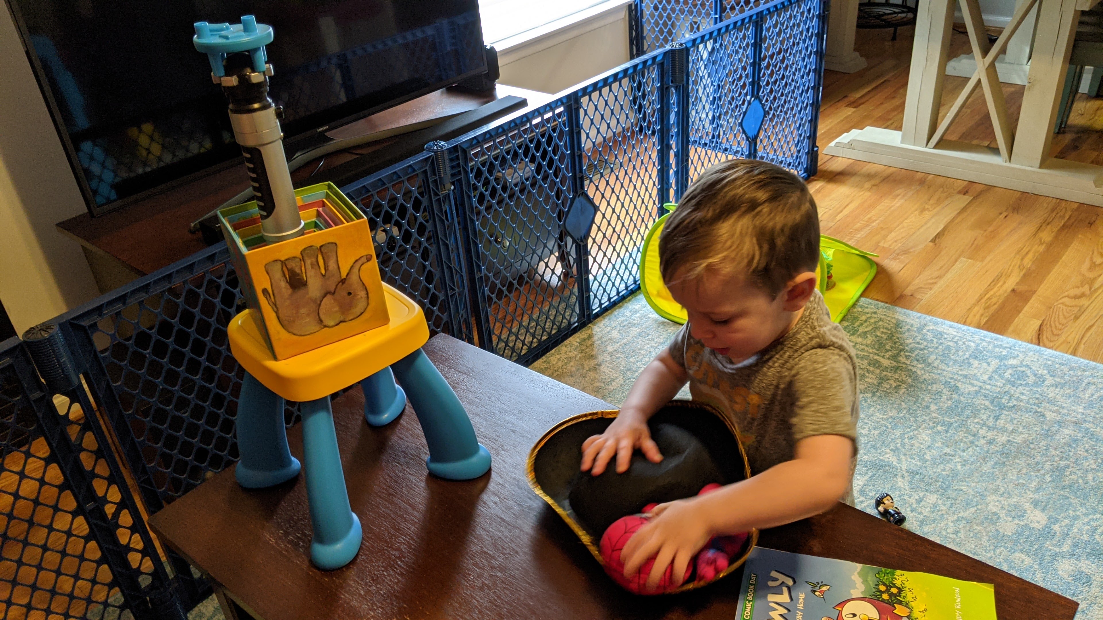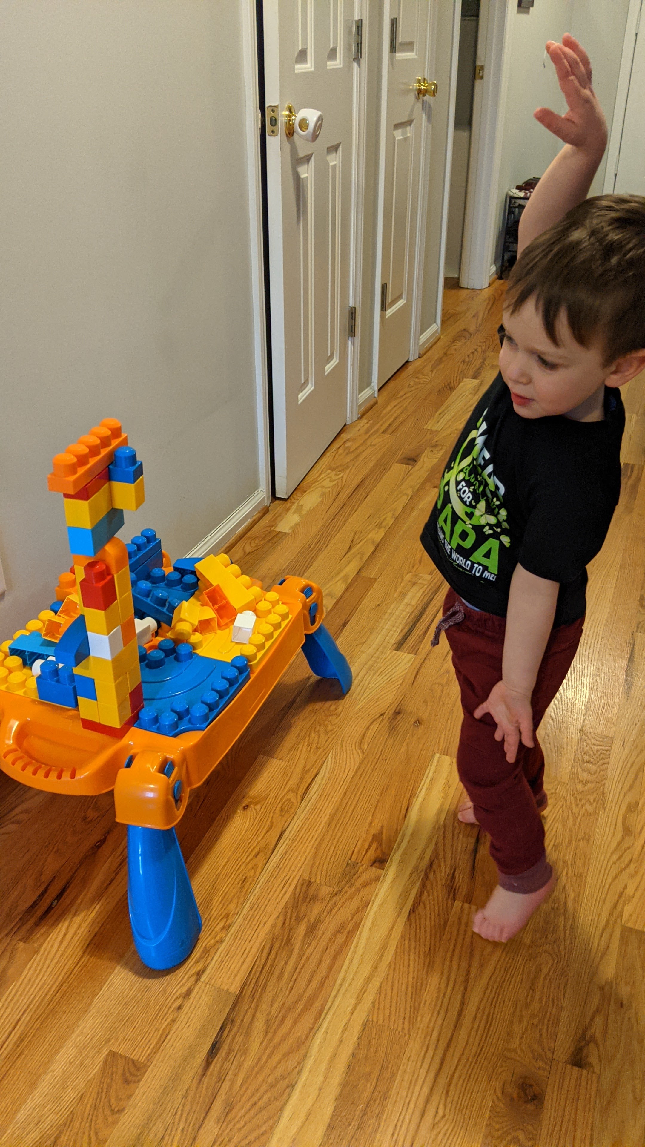 Miles has taken this hobby beyond obvious block-based construction. Put enough random objects in front of him and he’ll want to build a tower out of those, too.