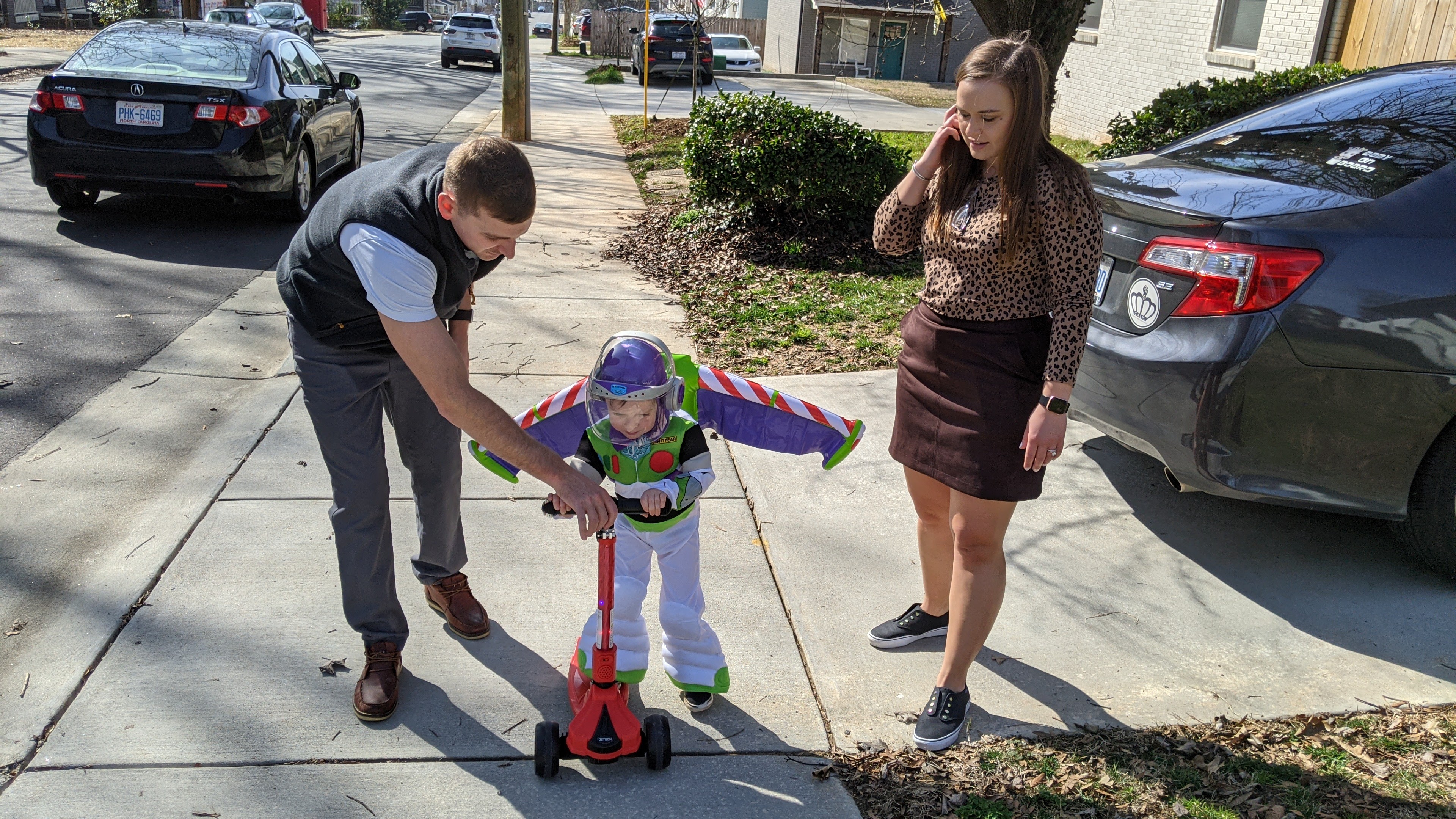 …ended with Miles motoring down the sidewalk dressed as Buzz Lightyear.