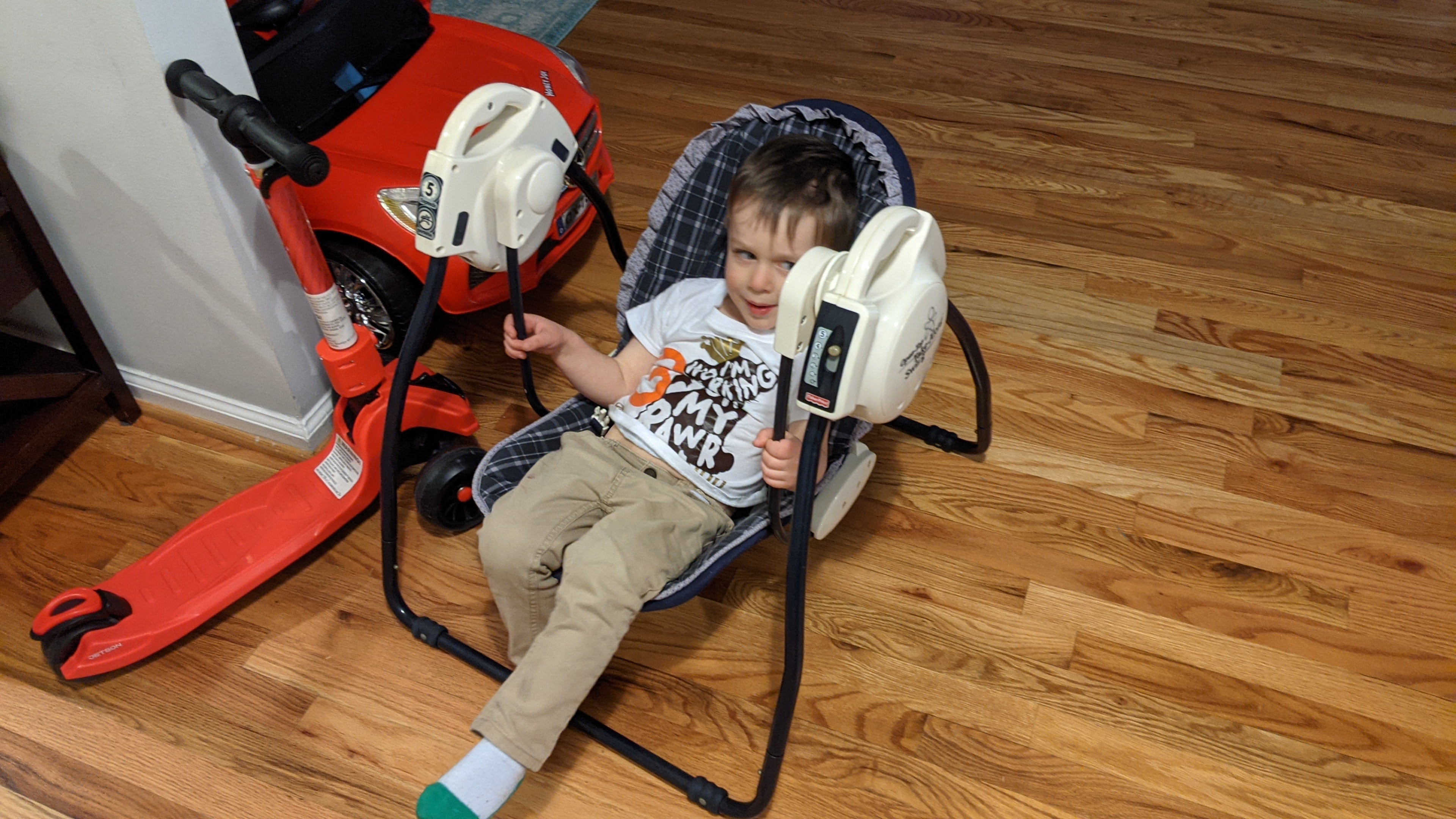 Our slow motion move into the new house has unearthed a few objects from Miles’s past, ones that he hasn’t quite figured out that he’s a little too big for now.