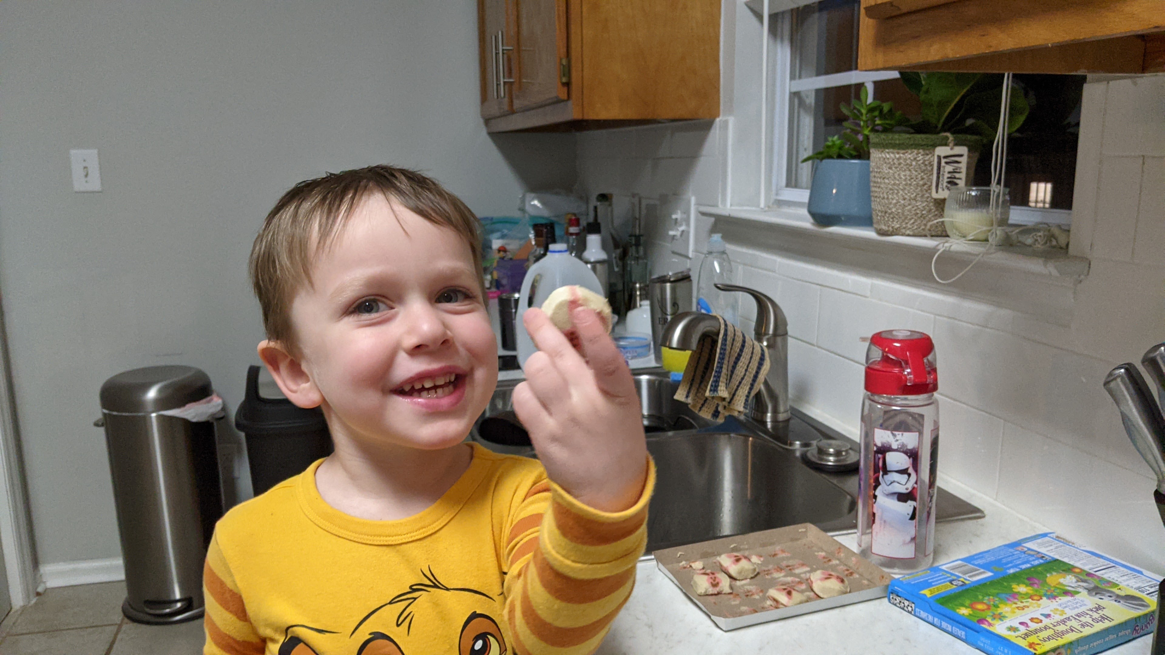 After he finished his bath tonight, Miles got to help me bake some Easter cookies. He insisted on doing as much of the prep as possible, which thanks to the fine folks at Pillsbury basically meant moving the chunks of dough from the package to a baking sheet.