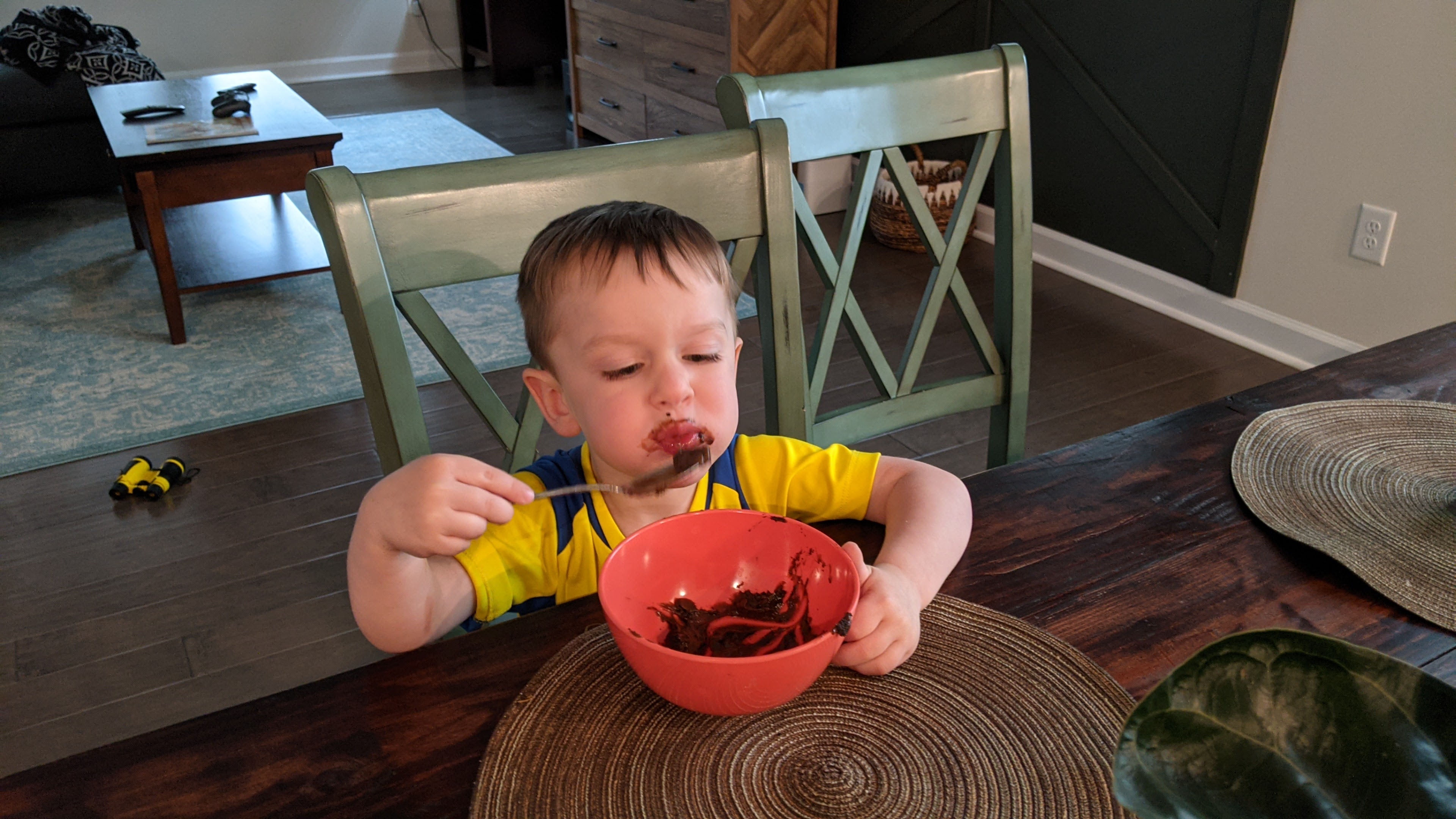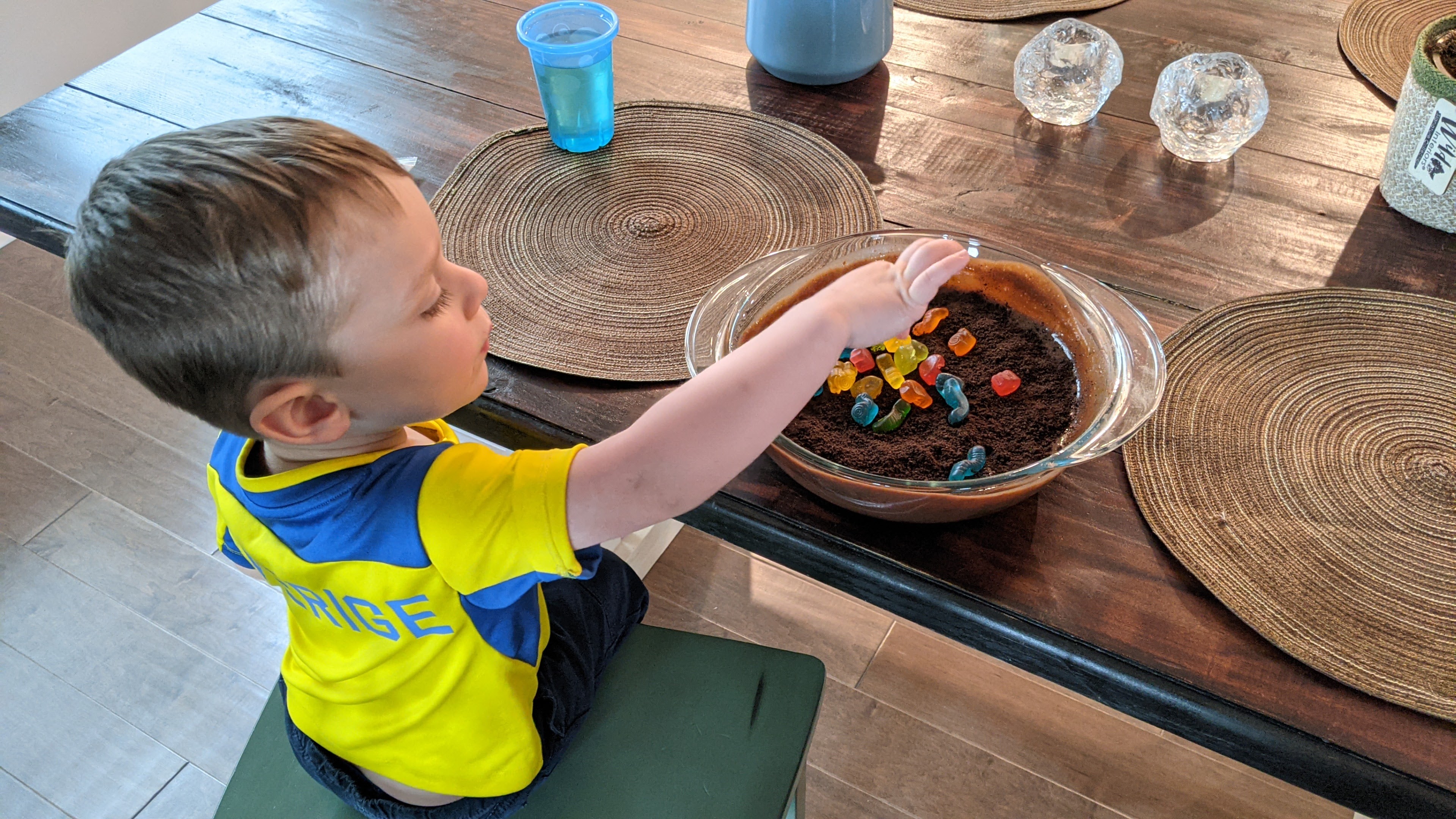 Like any culinary artist, Miles takes great pride in putting the finishing touches on Jell-O dirt dessert.