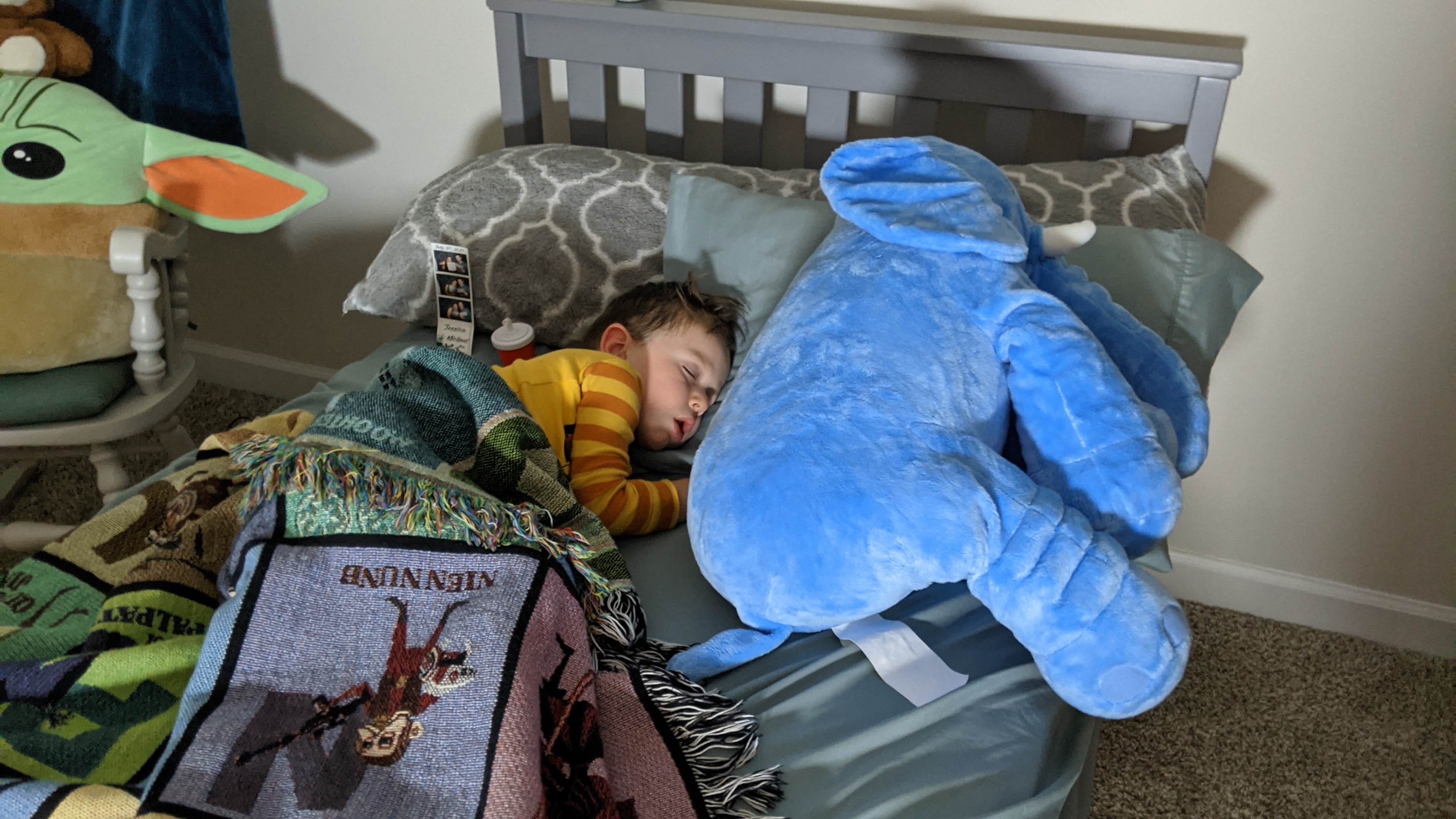 Still, no matter what sort of day Miles or I have had, I always try to say goodnight to to him before bed. Last night it took me a few minutes to get to his room (here’s an Easter Egg — I was actually updating this blog at the time), and by the time I got there he was already asleep. Still, I stepped over, leaned in, and kissed his forehead.