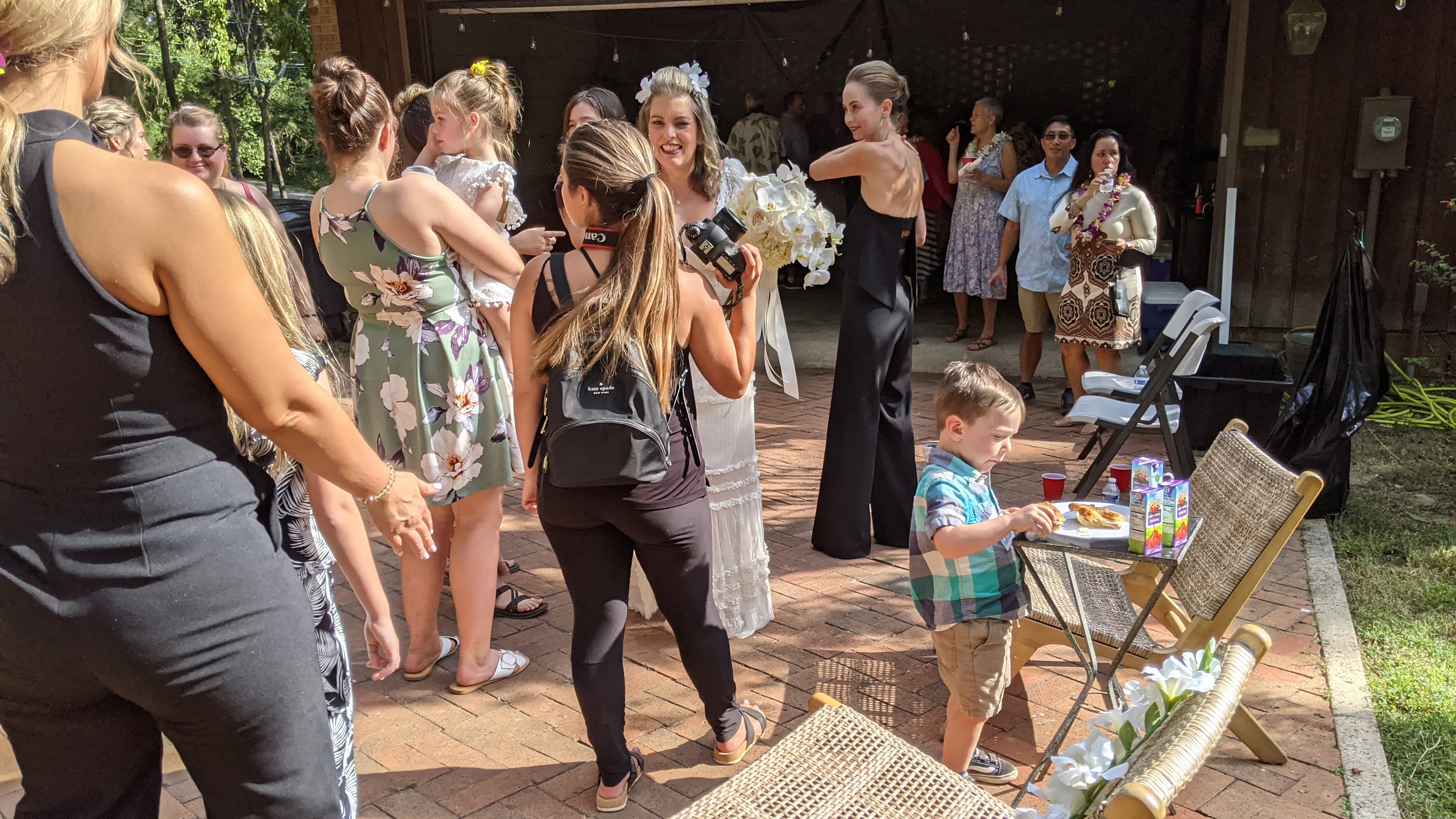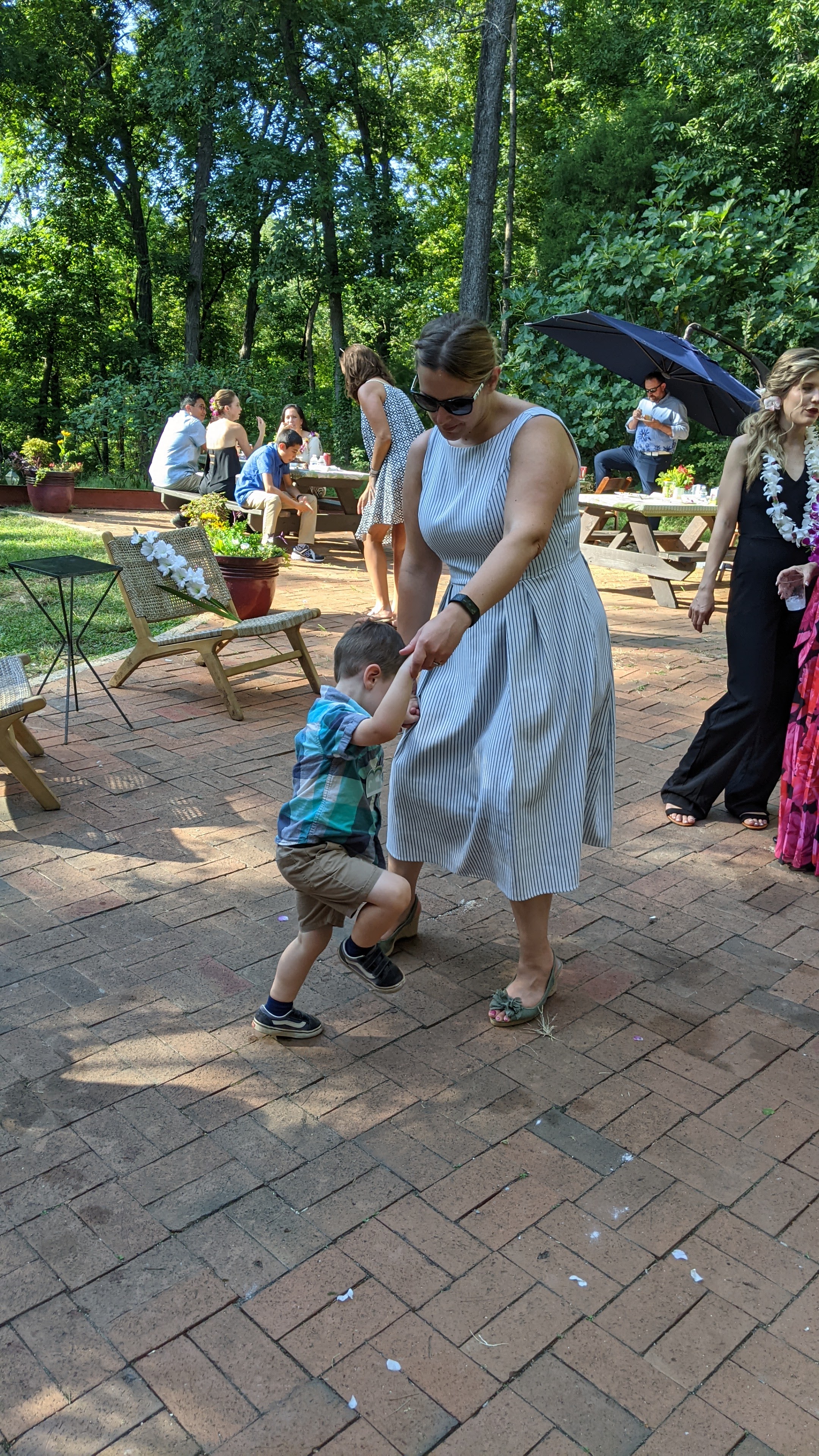 The next wedding was one we got a bit more dressed up for, as our friends Amy and Chris finally tied the knot (their son Duke is one of Miles’s buddies). The ceremony was outdoors, and of course Miles’s first order of business was to acquire a stick and start playing in the messiest corner of the yard.