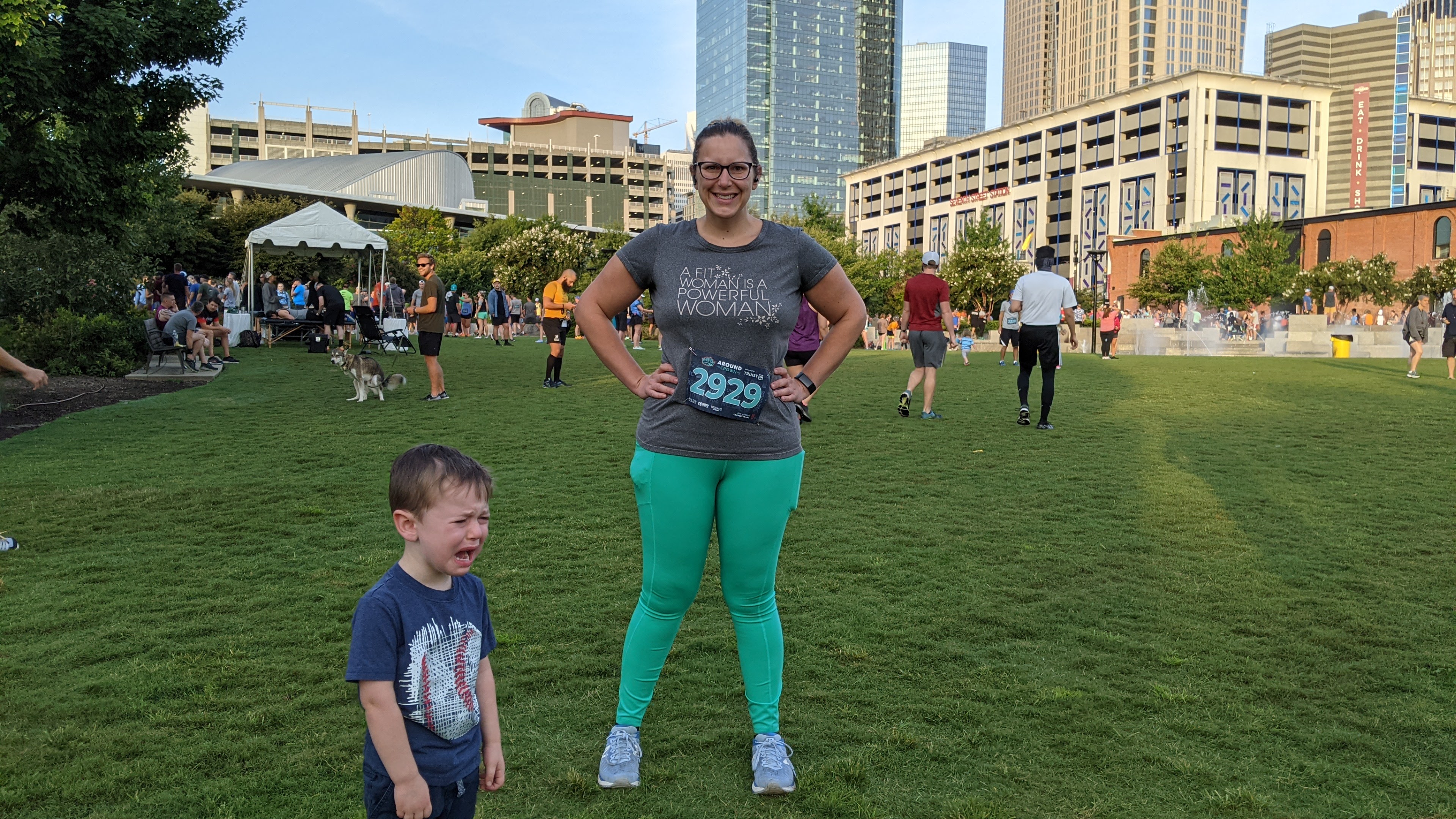 We all got up bright and early today so Jaclyn could participate in her first 10K (!), Charlotte’s Around the Crown race. Miles in particular was really excited to go…until he learned that he wasn’t going to be able to run with Mommy.