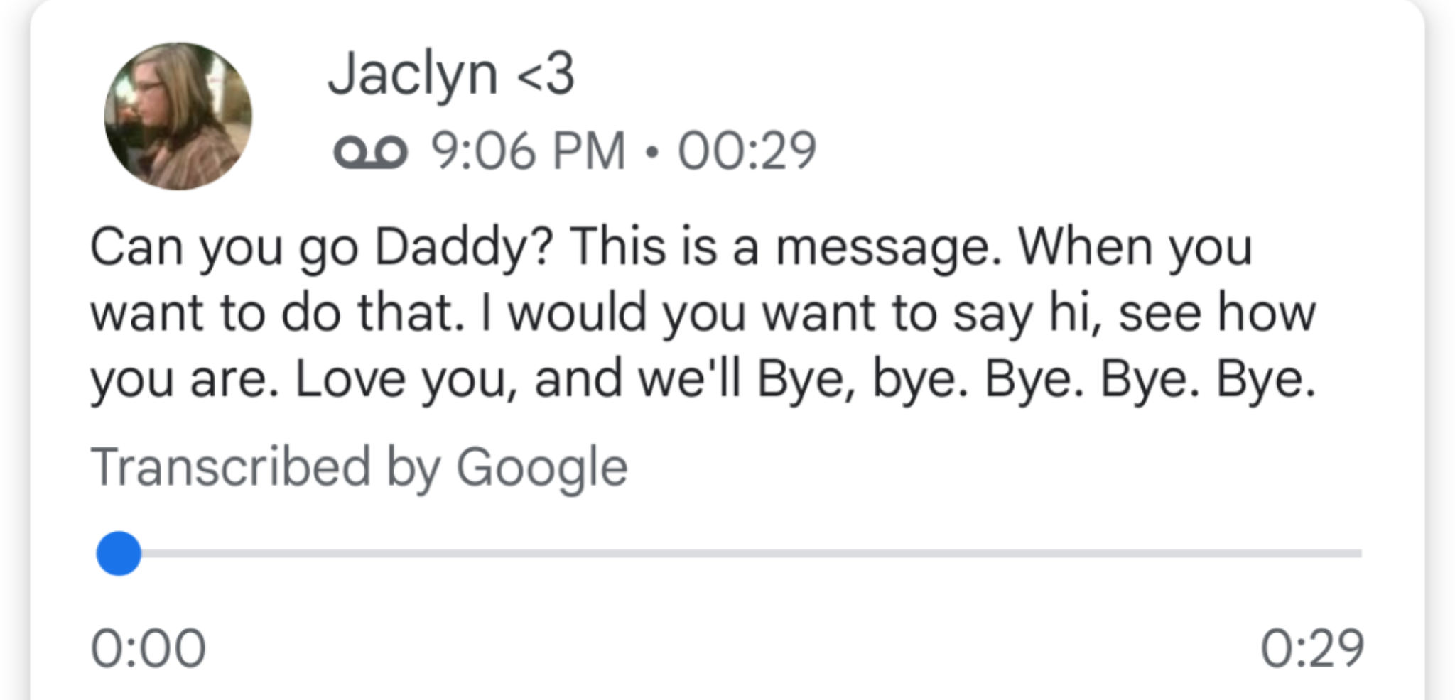 I left Charlotte yesterday to oversee the wedding of my friends Richard and Renee, leaving Miles and Jaclyn alone for a night. Before I went to bed following the rehearsal dinner, I received a voicemail that Google graciously transcribed for me. If you think listening to the actual message was any clearer, you are incorrect.