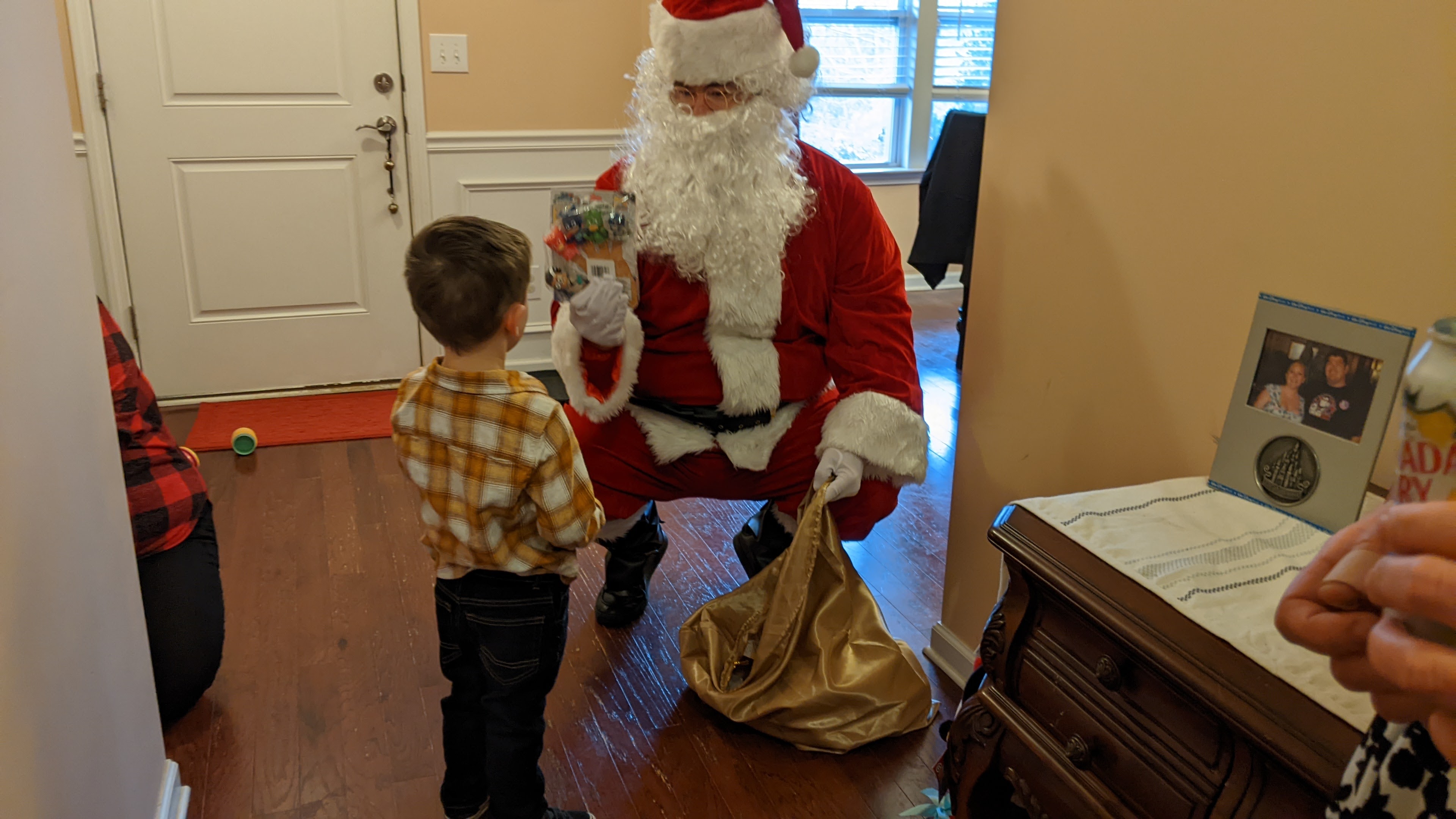 Meeting Santa Claus and giving the big guy a piece of your mind is an essential part of growing up (depending on your belief in either Christian holidays or capitalism), and thankfully our friends Jeff and Arianne…er…hosted St. Nick for the second year (Santa’s trying to stay away from big crowds during a pandemic, after all). With Miles approaching his fourth birthday, we’re pretty sure he’s at the point that he’ll start holding onto and carrying memories with him, so a visit with Santa was a critical part of our holiday puzzle.