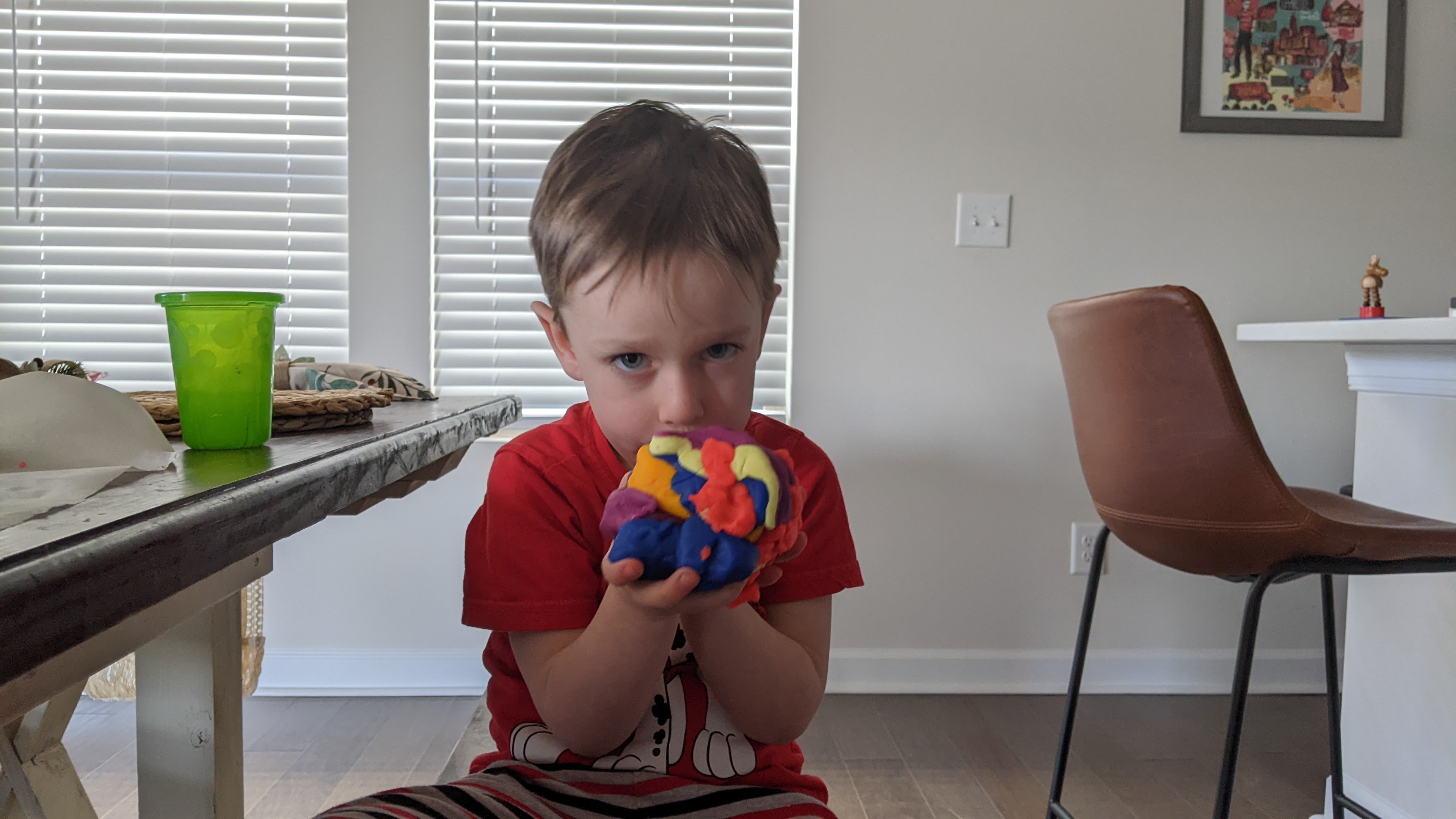 Miles’s request to play with his Christmas Play-Doh started small enough — he only asked me to open one container of the six he received — but of course he slowly asked for more and more. And, as all small boys must, he took the logical next step of mashing them all together into a blob.
