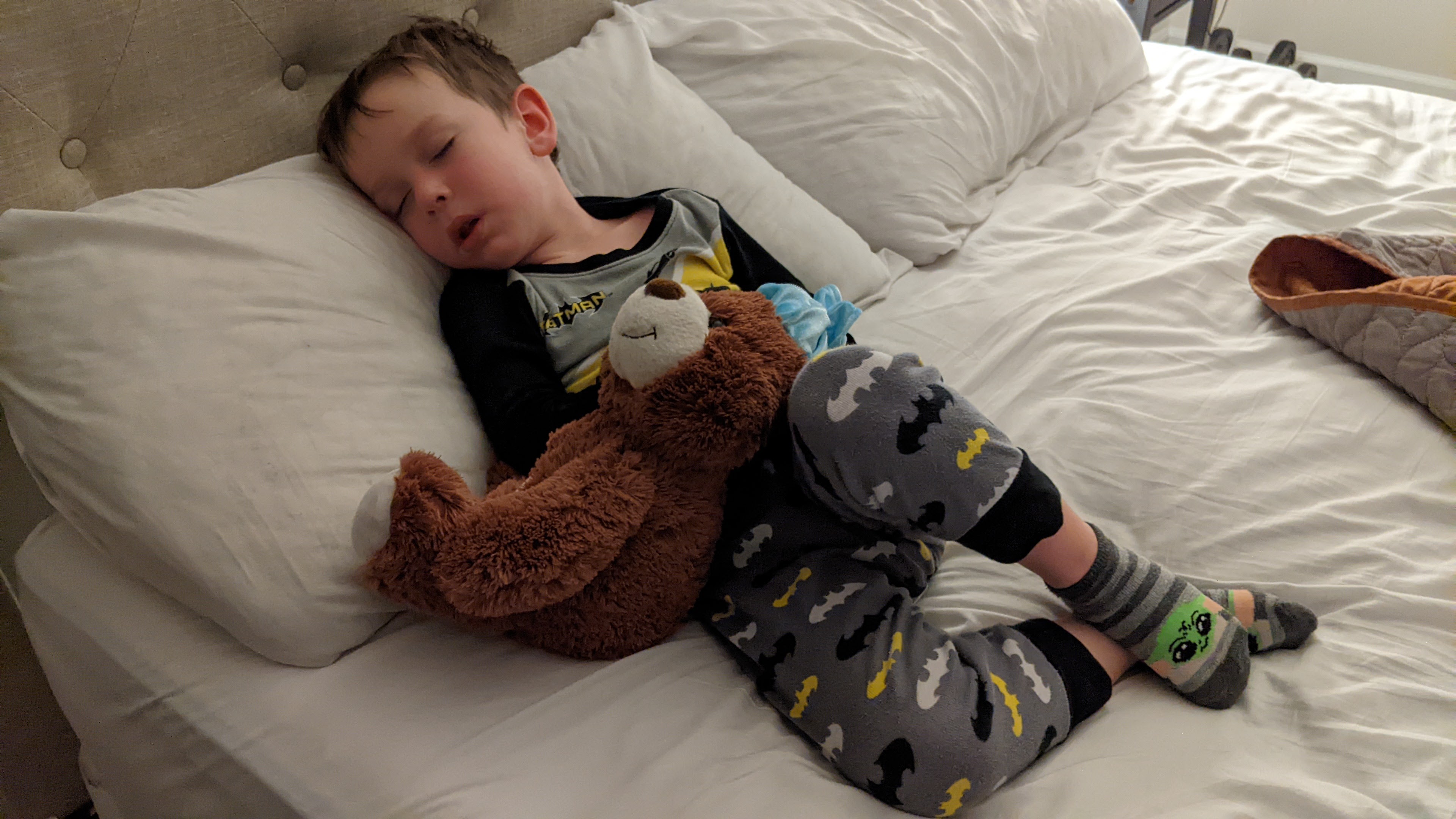 Speaking of struggling, when I came home from trivia tonight, I found Miles asleep in our bed. “What’s the sleeping plan tonight?” I asked Jaclyn, knowing that only one of us could fit into the bed unless we moved Miles to his room (something we wanted to avoid in the hope he would just sleep through the night).
