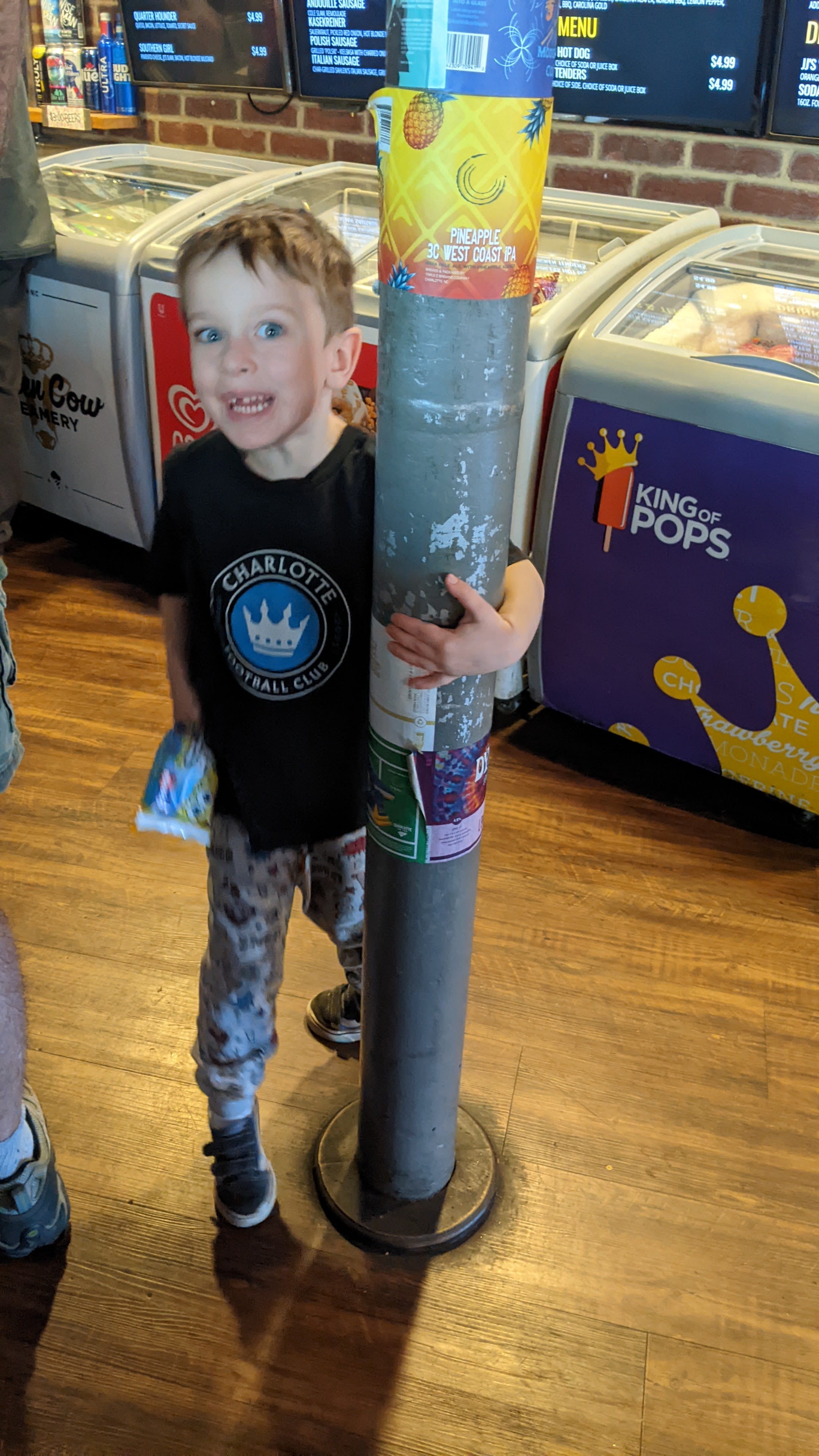 I took Miles out for lunch after German school this morning. He requested “tater tots and a hot dog,” so we went to JJ’s Red Hots. By the time we were there, Miles agreed only to “tater tots.” And once he realized they had ice cream bars and popsicles there, his interest in even tots began to wane.