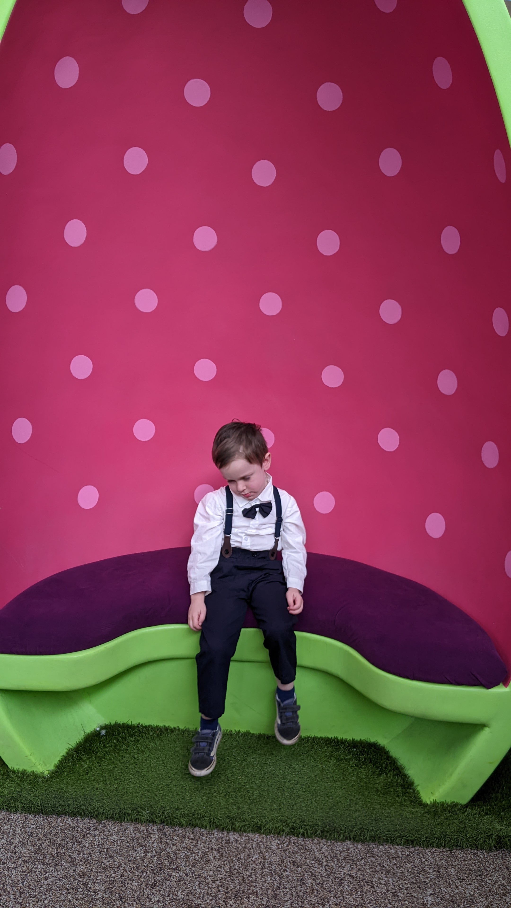 Today, we made the trip to Augusta, GA to visit Miles’s friend Audrey for Easter weekend. The first order of business upon arriving was to pay an essential trip to the Easter Bunny for pictures. Alas, when we arrived for our appointment, we were faced with the news that the Easter Bunny had fallen ill and had to leave for the day. His handlers did, at least, let us take some pictures upon the rabbit’s throne.