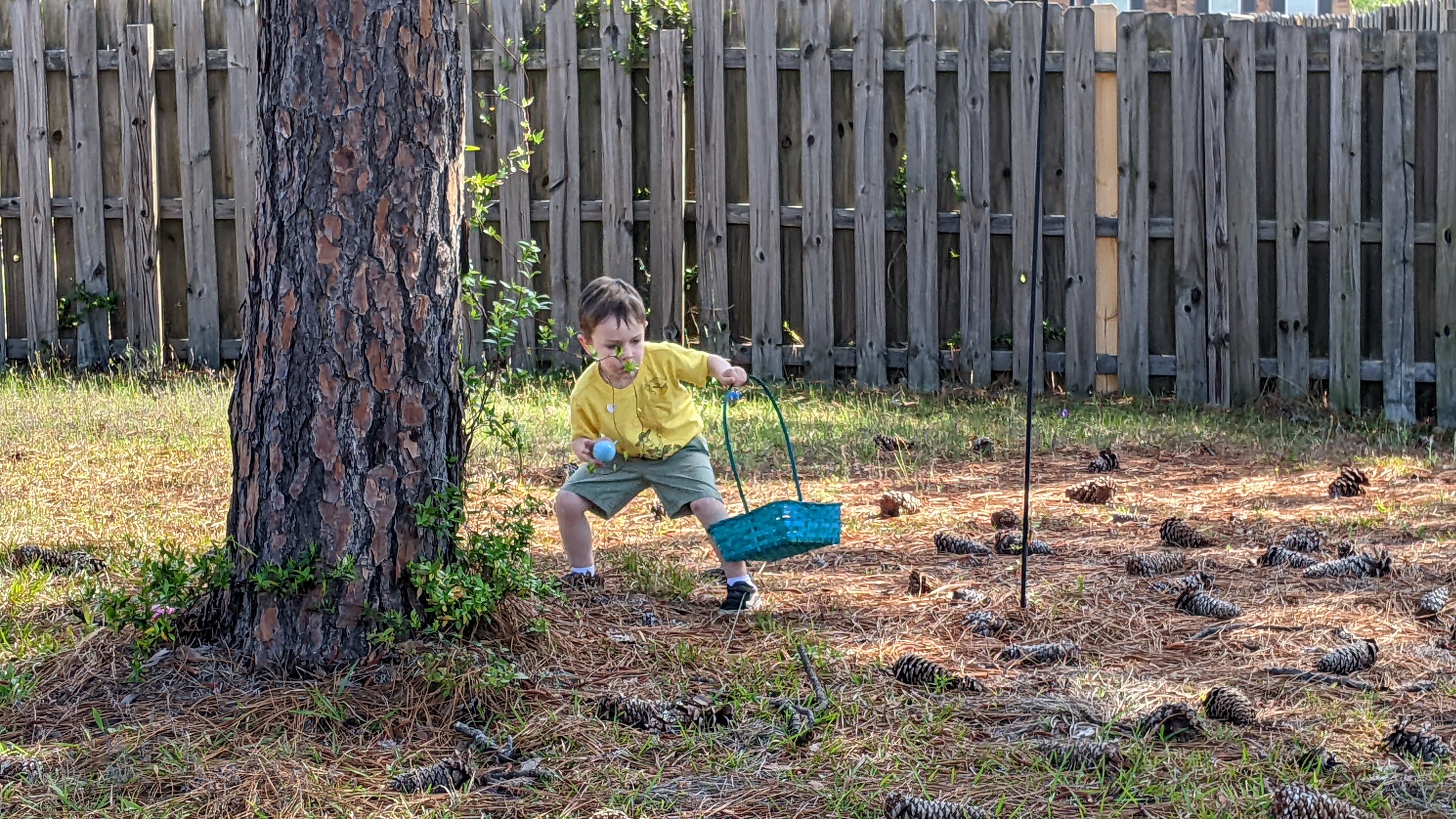 Considering the Easters of years’ past, Miles was very curious where the Easter Bunny had hidden eggs this year. Fortunately, George — I mean THE EASTER BUNNY — took care of stashing eggs all across the backyard.