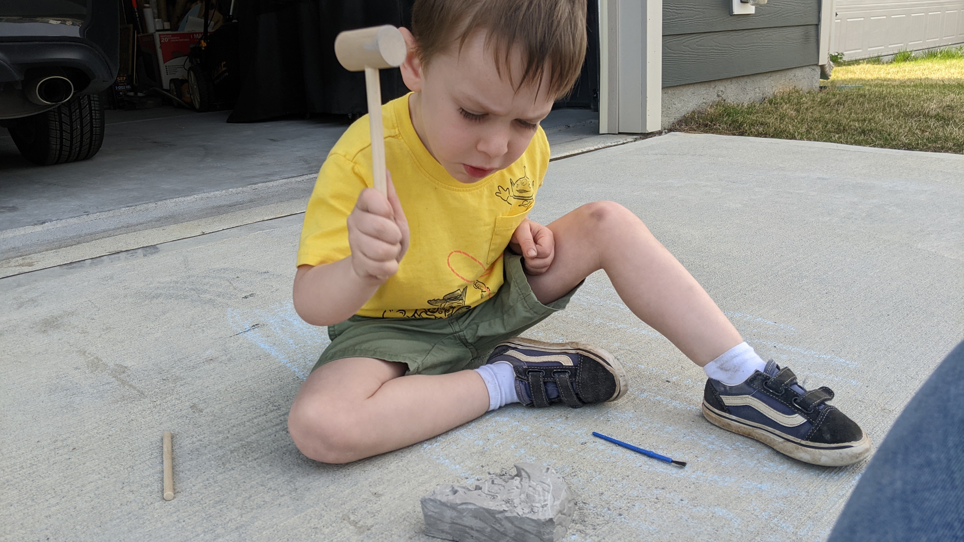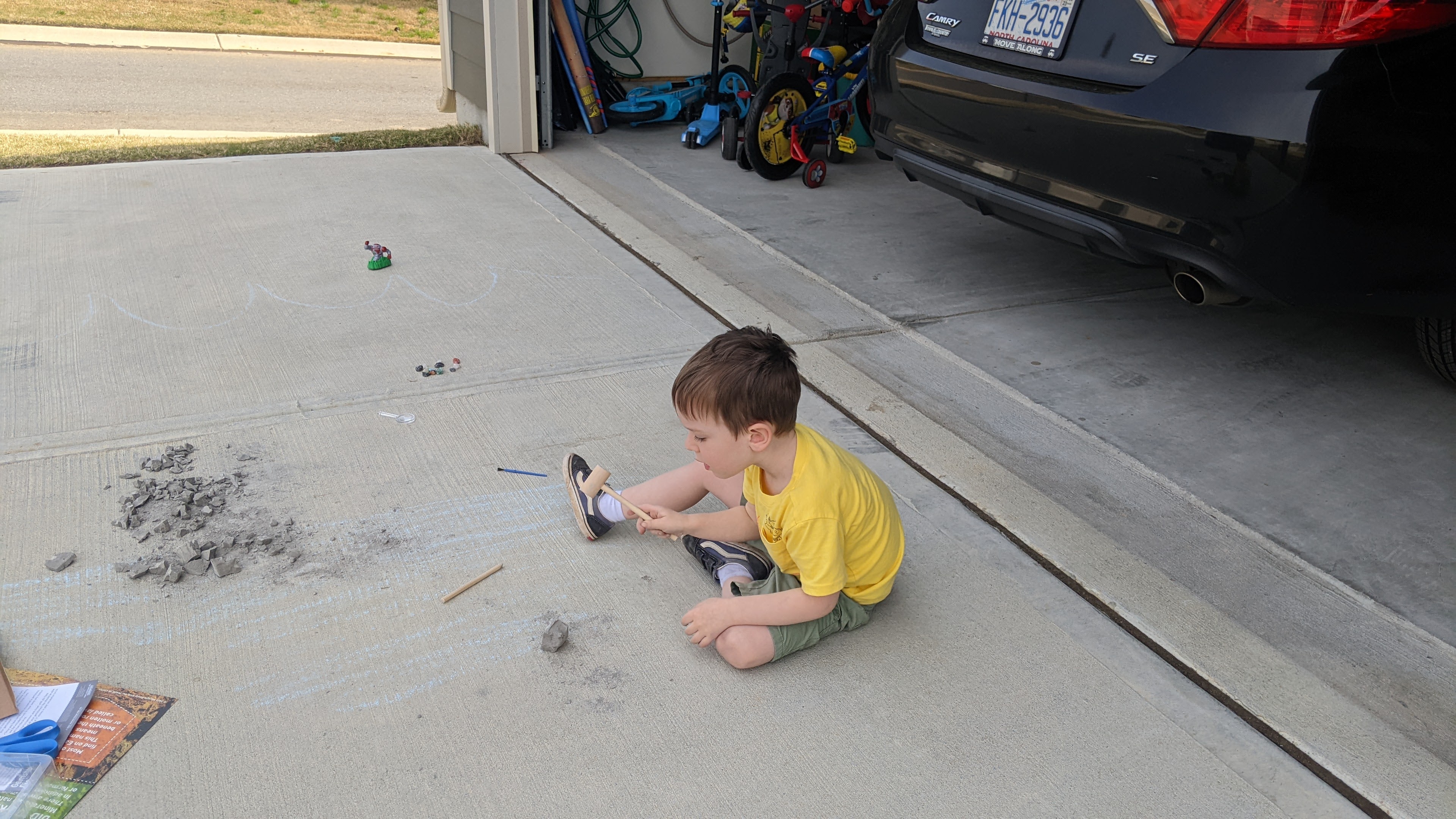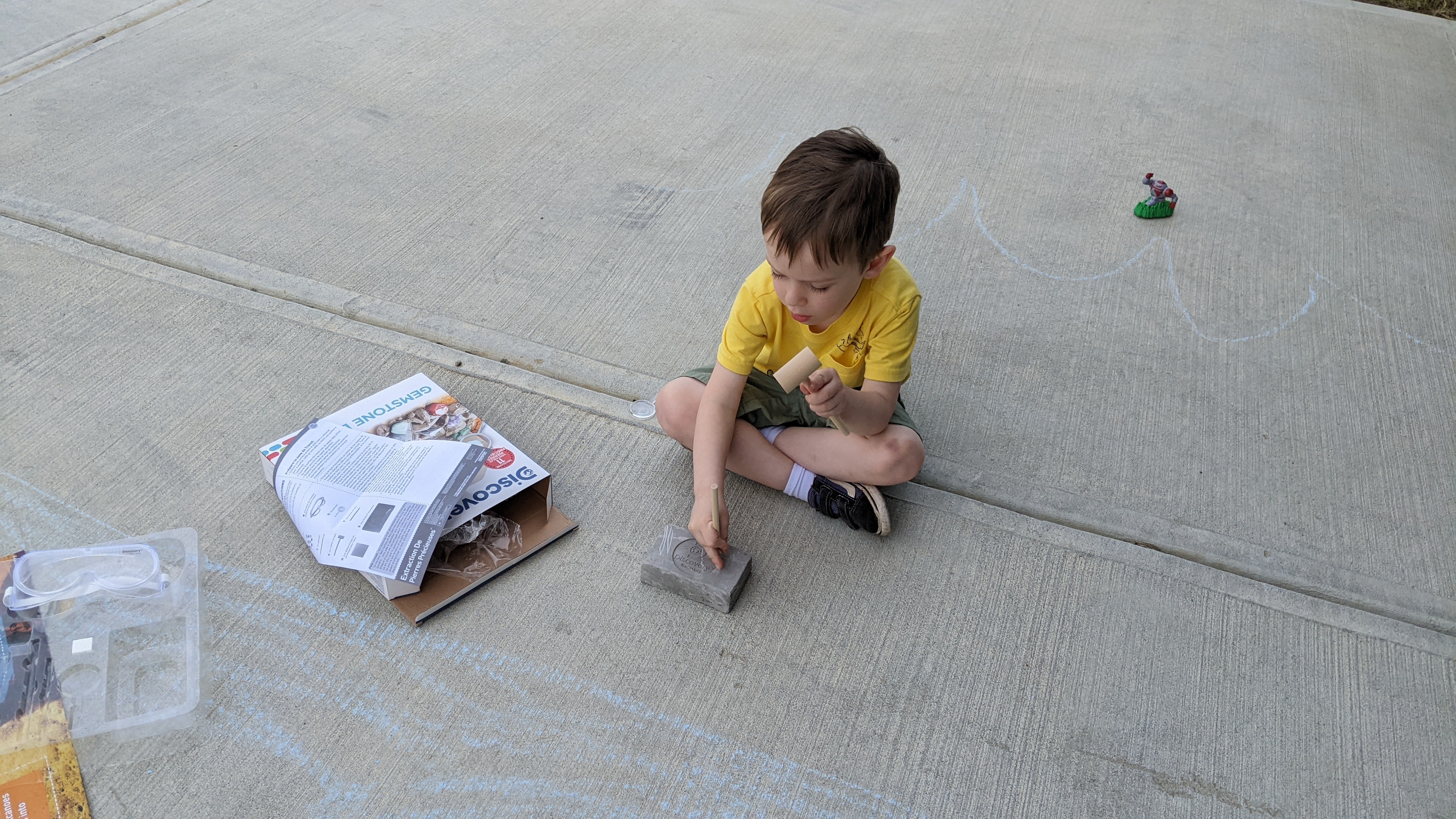 This past weekend, in an effort to appease Miles’s persistent desires to 1) go outside and 2) break the ever-loving s*** out of something, I pulled out one of his birthday gifts — a gemstone digging set.