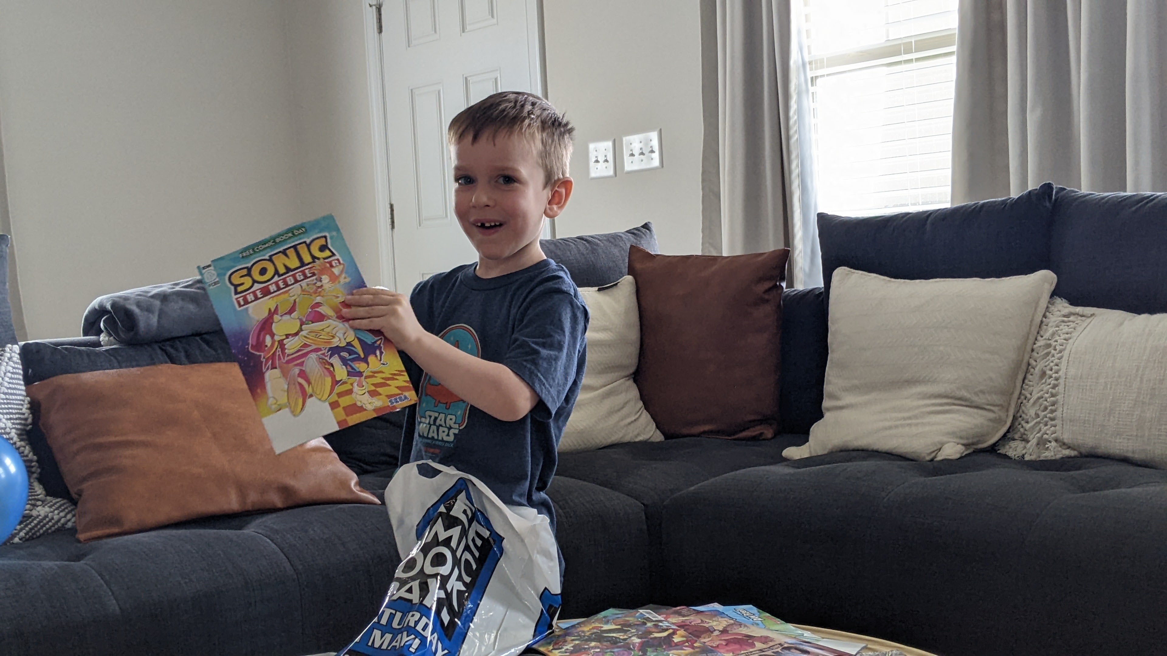 Miles ended up with WAY more comics than I (or he, probably) expected (and a couple Golden Books the shop had, too), and he was thrilled to open his bag once we got home and dig into his bounty.