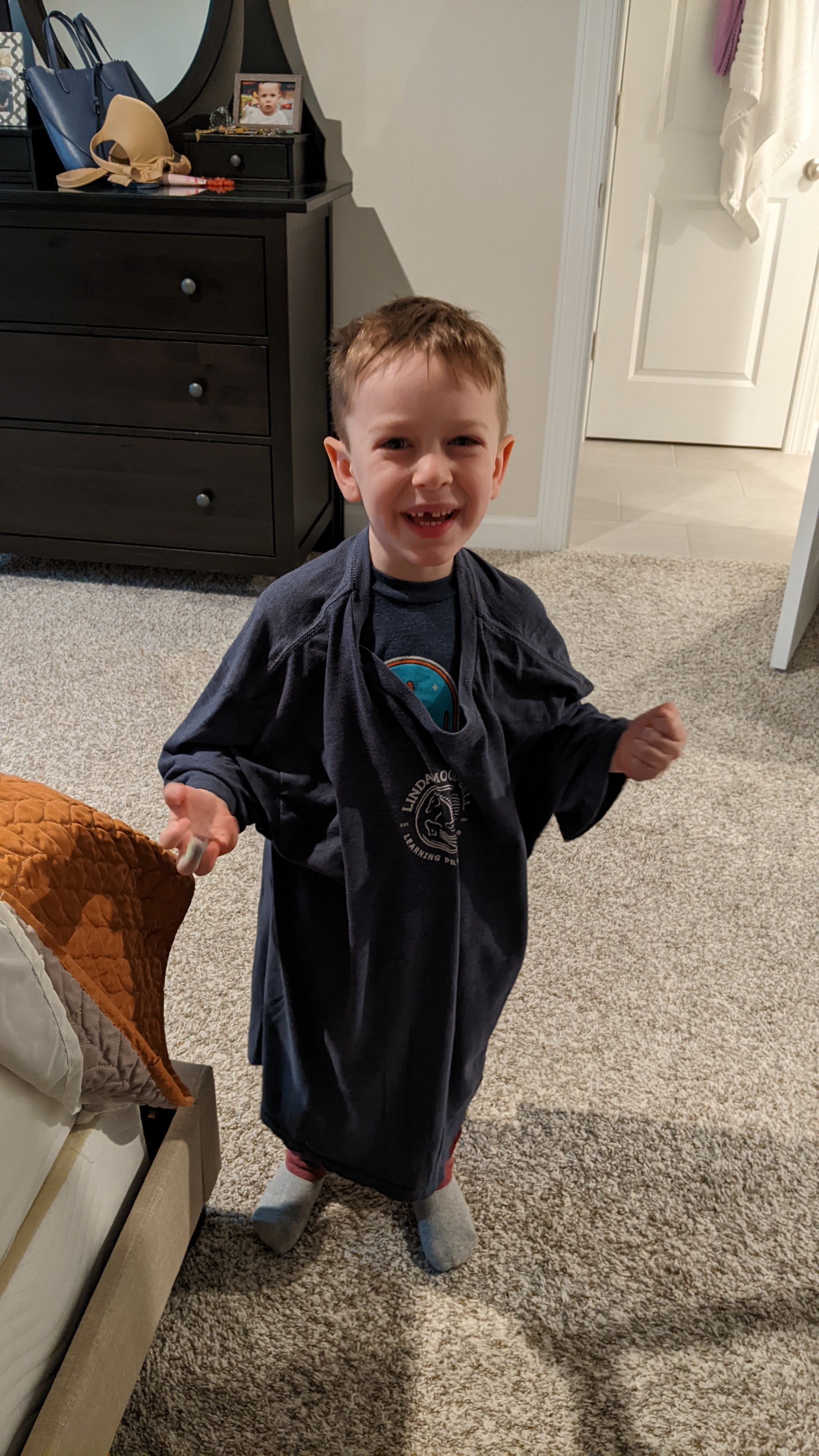 “I’m dressing in Daddy’s shirt!” – Miles, attempting to steal my work shirt and take my place at my job today (SPOILERS: If it were at all plausible I would TOTALLY let him).