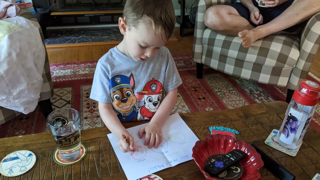 Maybe it was the praise that we heaped upon Miles’s artwork, but he immediately changed his tune about what the day was, who the cards belonged to, and who exactly was being celebrated. Can you guess who Miles decided today was really in honor of?