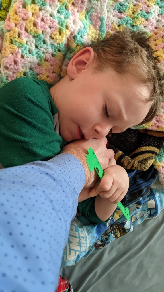I had to head out for work early today, before Miles was even out of bed. I still went by his room to see him before I left, and although he seemed to be sleeping soundly, as I said I’d see him later, he lashed out and seized my arm. He didn’t say a word or open his eyes. He just let me know that I actually wouldn’t be leaving right that moment.