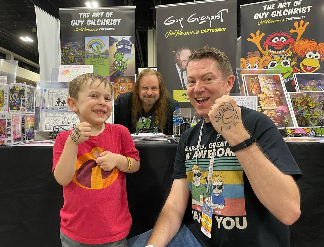 Miles definitely found something of interest when we visited Guy Gilchrist’s table. An artist for properties such as Muppets and Teenage Mutant Ninja Turtles, Miles quickly spotted a print he wanted. Mr. Gilchrist even drew Ninja Turtles on our hands!