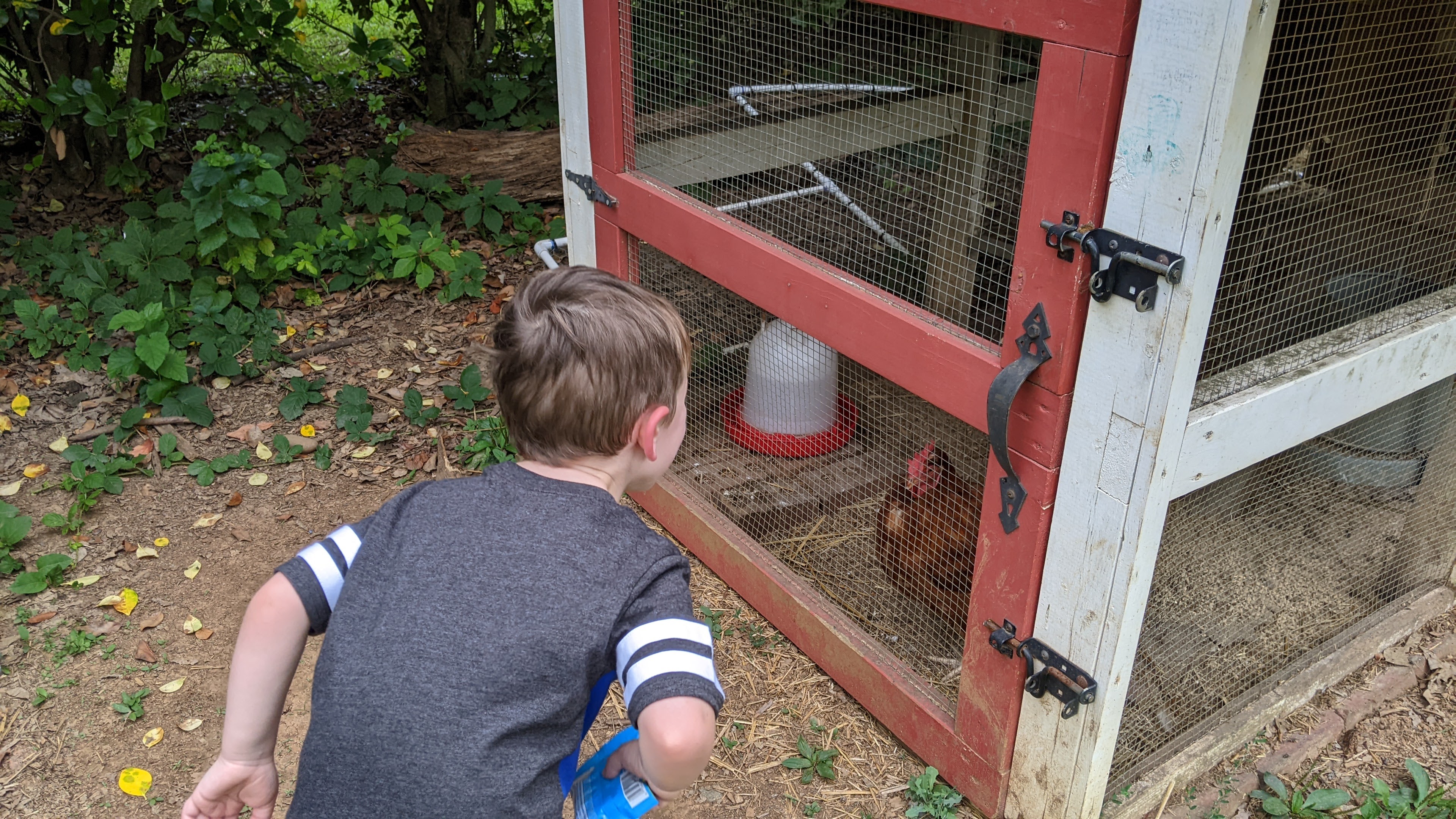 Miles has been to this school with me once before, so he already knew where to find “the goods,” which in this case were fruit gummies (which we keep on-hand for the students, but that Miles feels he can help himself to) and…uh…chickens.