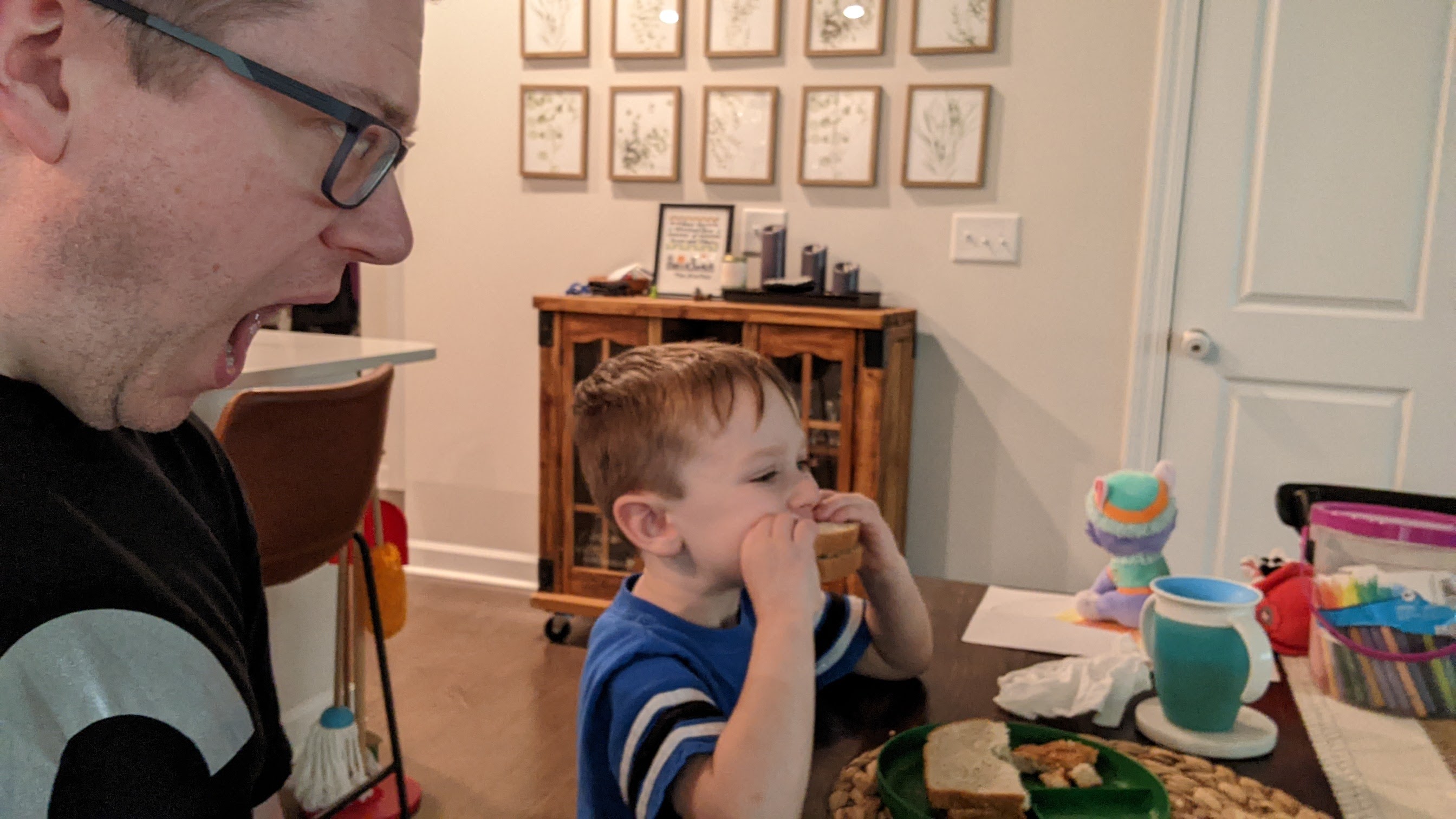 One evening recently, when I was trying anything to find something Miles would agree to eat, I introduced him to the concept of the peanut butter and honey sandwich. He now requests the combination regularly. In fact, after finishing one I made for him today, Miles asked for a second.