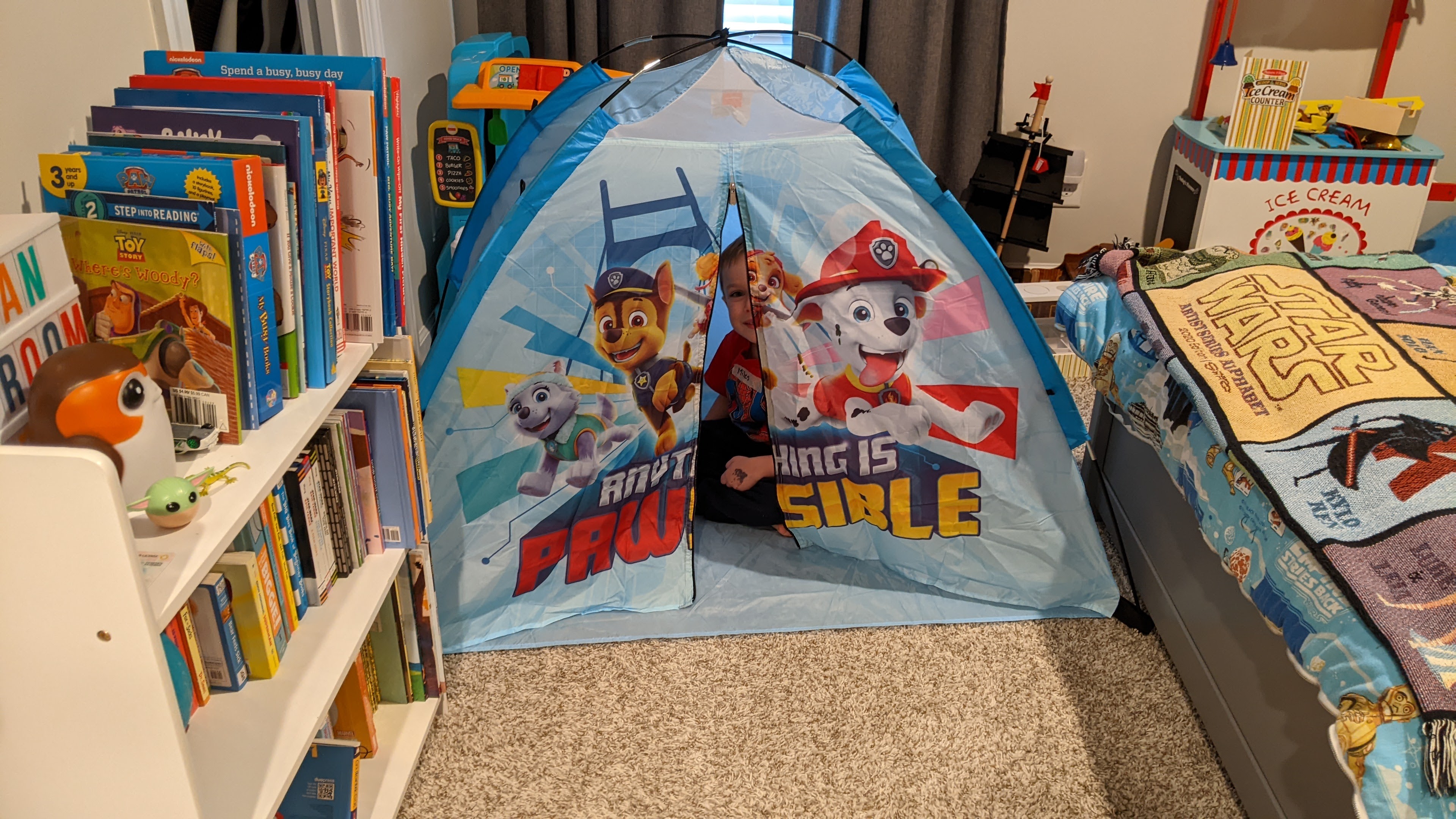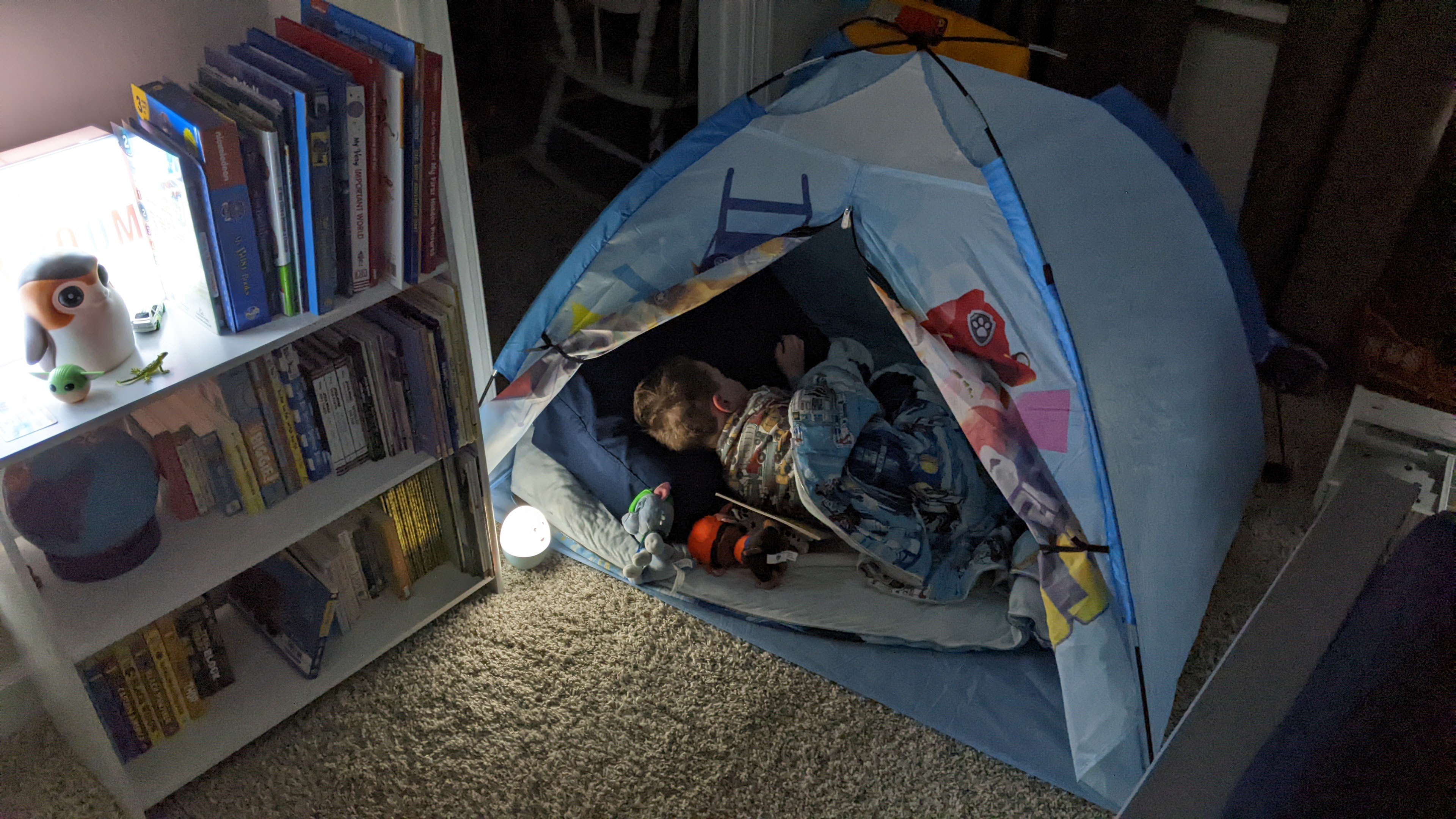 For the last couple of weeks, Miles has been asking me to put his tent up for a “camp out.” Since Jaclyn was hosting a ladies’ night downstairs this evening, I thought tonight would be the perfect time for a camping trip.