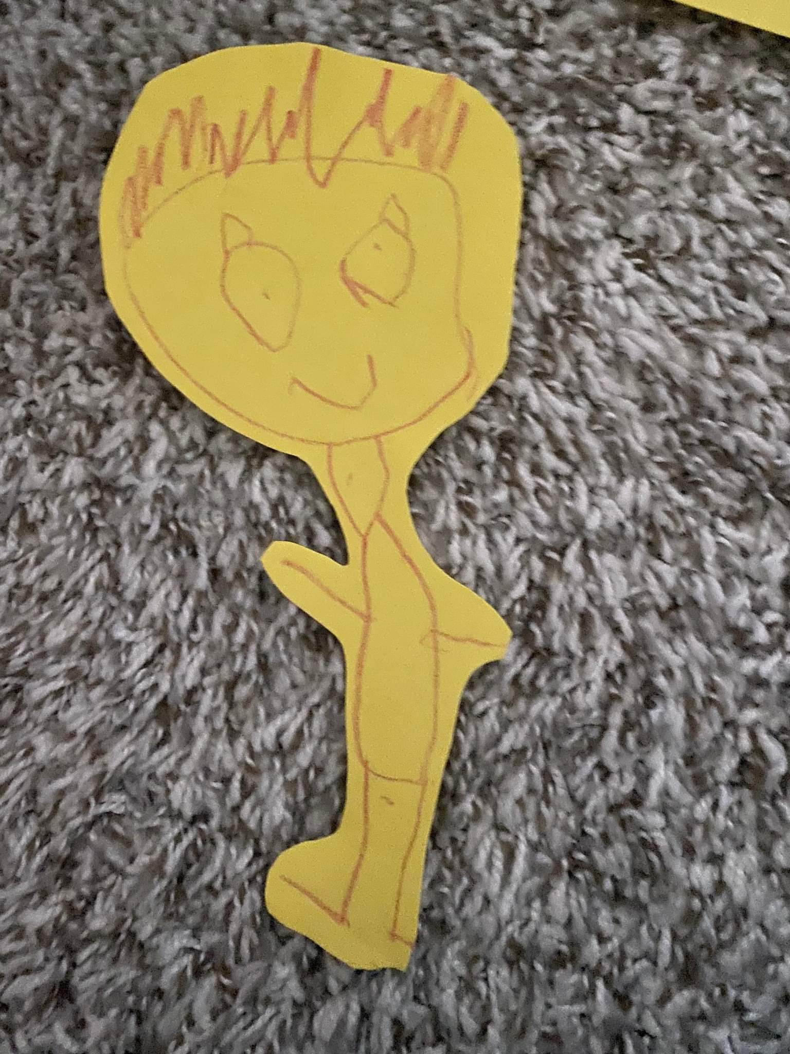 Miles stayed home sick today, but he still found the energy for some arts and crafts*. Jaclyn sent me pictures of some of his creations, including this self-portrait and drawing of Brie.