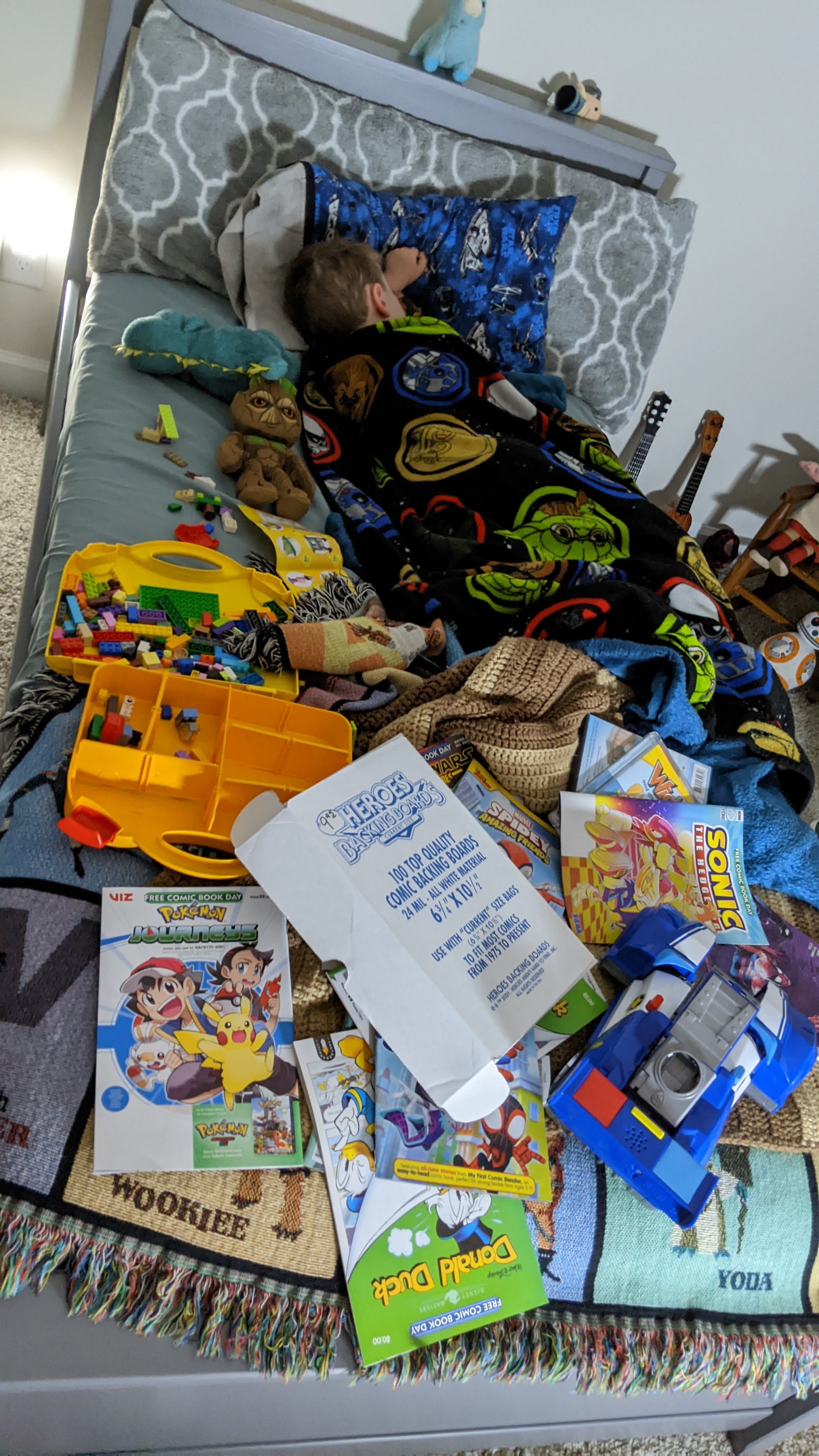 Miles turned his light off, turned on his marquee night light, and collapsed in bed. He didn’t wake up until around 3 am, at which point he came into our room, climbed into bed with us, and…continued to sleep. Maybe he’s finally learning that the key to getting better is CALMING TF DOWN?