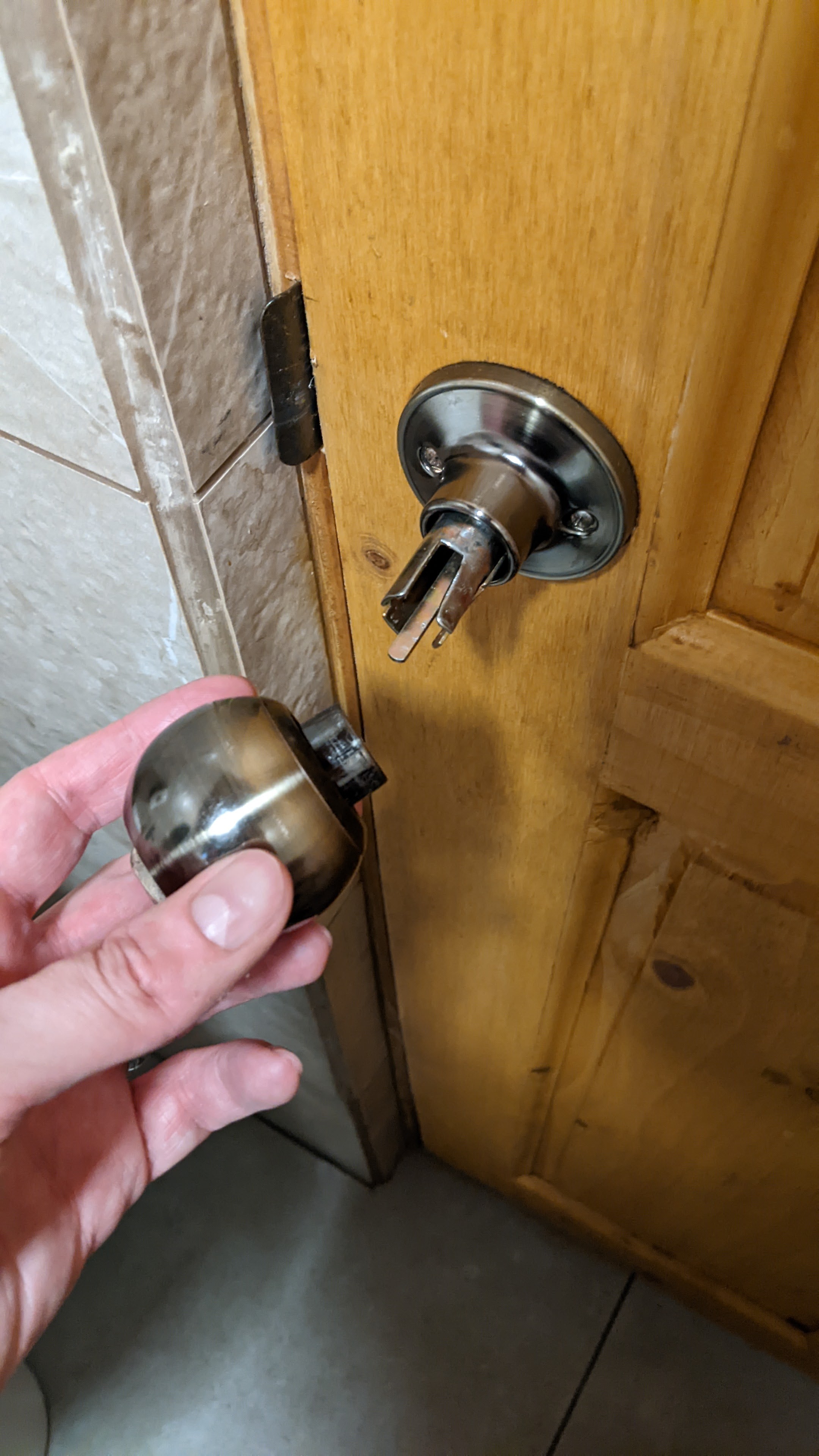 On a mandatory pre-hike potty break, Miles and I literally got locked in a restroom when the doorknob came off in my hand. While I was at least slightly amused, Miles immediately went into survival mode.