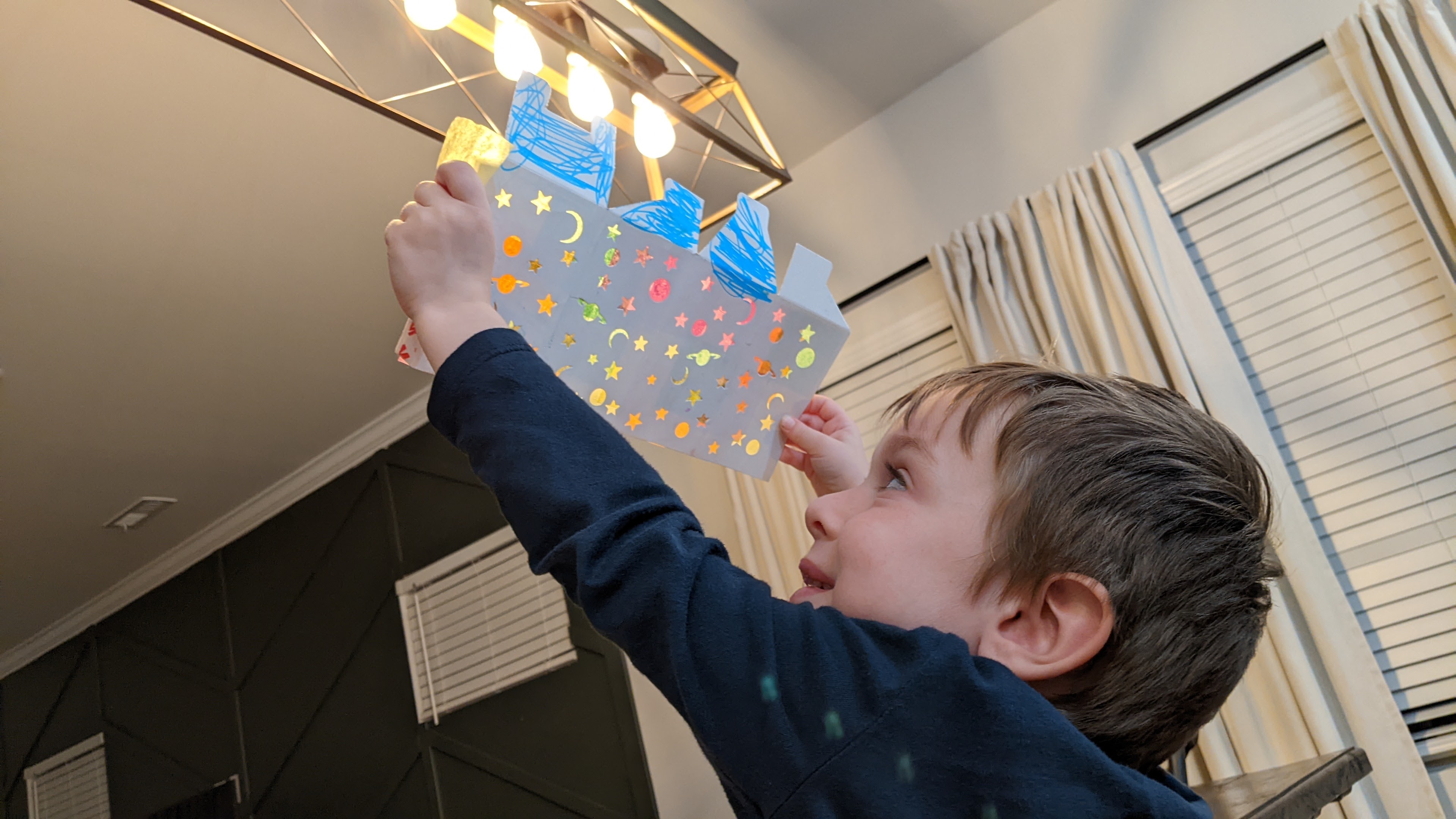 Our regularly-scheduled Family Movie Night got punted this week, as Miles needed to finish decorating a lantern for his German School’s impending lantern festival tomorrow. He spent a lot of time coloring…the inside of it (I tried to tell him), but this didn’t bother him because the part he was most excited about was gluing colored tissue paper squares onto it, then holding it up to the light.