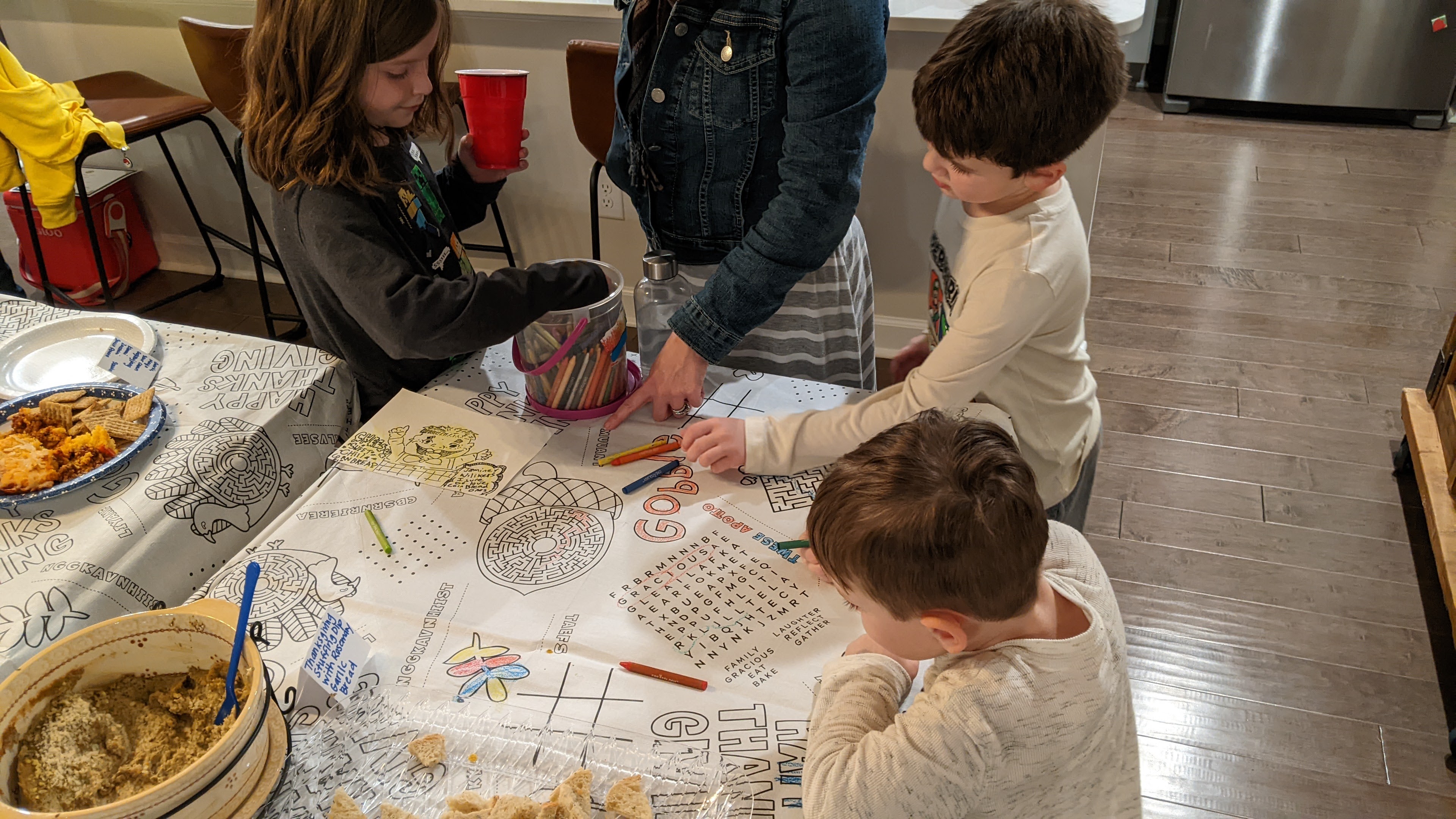 That’s not to say that this year’s Dipsgiving was an adults-only soirée. The kids partook of the dips as well, although they found the activity tablecloths much more interesting.