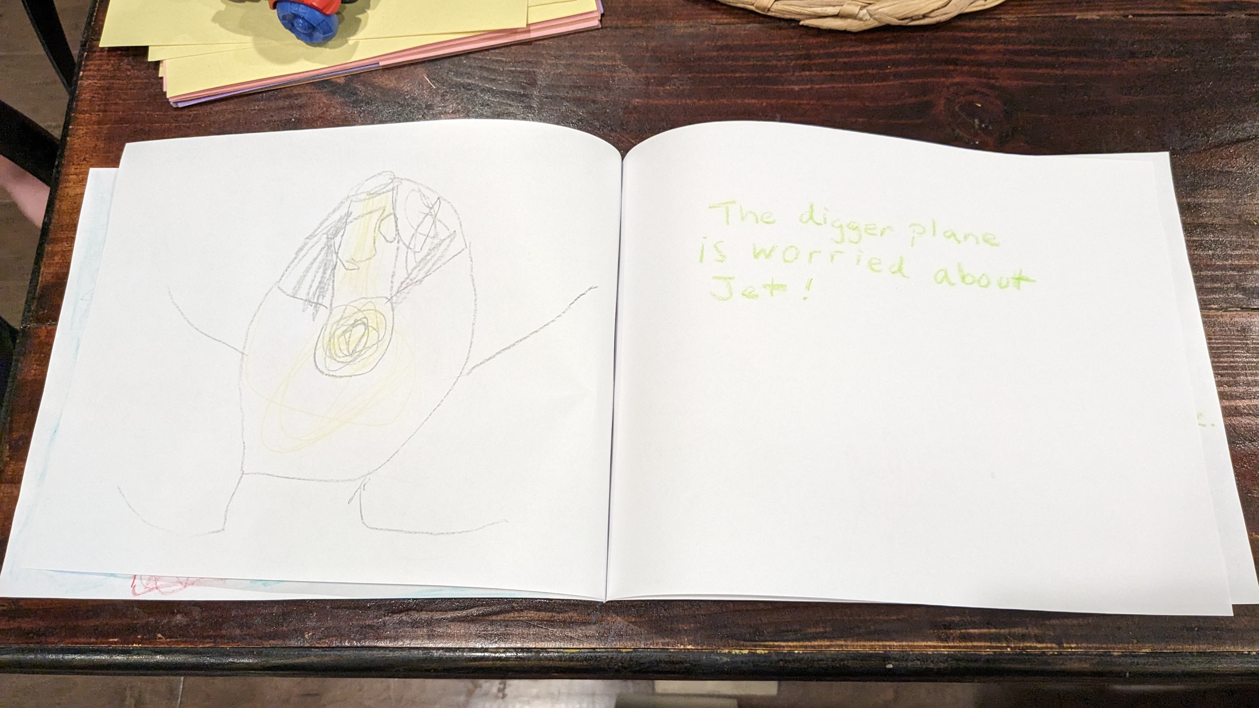The “thing that presses” that he was referring to was a stapler, and he was requesting it because he had completed the illustrations in his FIRST BOOK. At his direction (I’m a firm believer in artistic vision, after all), I stapled the pages together. He then dictated the text to me, which I transcribed precisely despite every urge to…embellish it. This might be the proudest I’ve ever been of him.