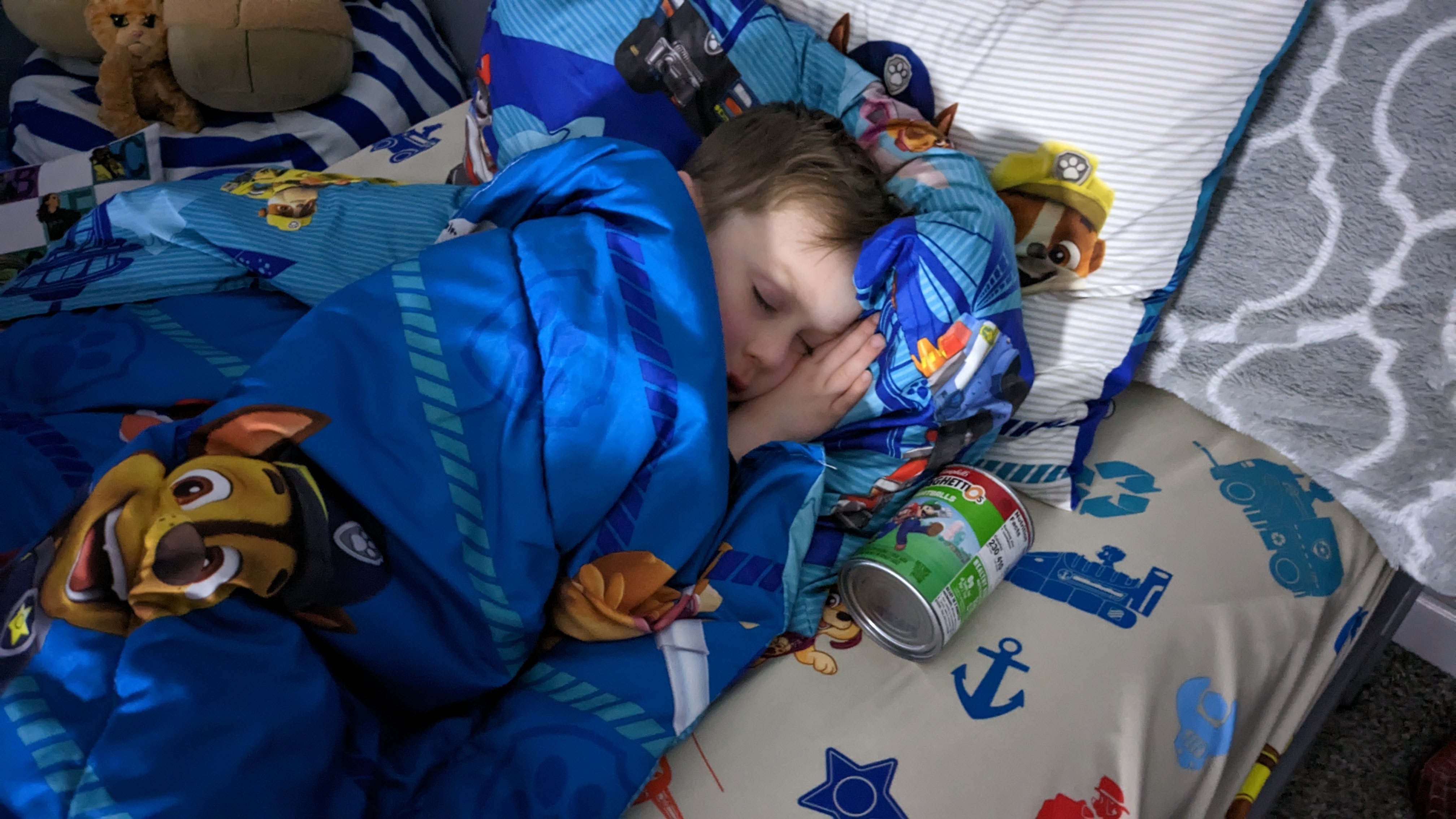 As he is wont to do, Miles climbed into our bed around 4:00 in the morning. And when Jaclyn woke up after rolling over onto something uncomfortable, she found that he had brought not only some stuffed animals with him, but the SpaghettiOs as well.